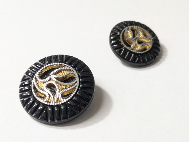 Vintage button 25㎜ 【価 格】770円(税込価格です) 【素 材】樹脂&メタル 【サイズ】25mm 【 色 】ブラック&シルバー&ゴールド ※複数の雫形シルバーパーツが華やかに施されたこちらのボタンは、ゴールドのアクセントが絶妙に組み合わさっています。周囲のブラックベースには刻み模様が施され、格調高い存在感を放っています。 ※サイズ展開として、他に20㎜(¥605)がございます。 →https://mutsumiya.base.shop/categories/4040549 CATEGORYから「ボタン」→「Vintage button 」を選択していただくと、表示されてきます。