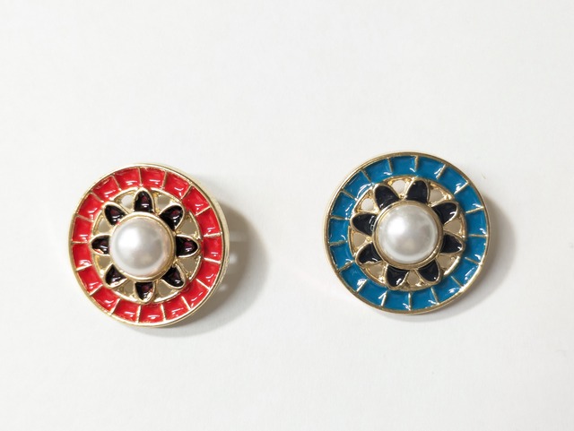 1月のボタン(秘色) 【価 格】1320円(税込価格です) 【素 材】メタル 【サイズ】25mm 【 色 】ブルー/レッド ※太陽のような輝きとファラオの王冠を思わせる華やかなデザインは、どんな作品にも個性的な魅力をプラスします。ゴールド&それぞれのカラーと中心に配置されたパールが、絶妙なハーモニーを生み出し、これまでにないスタイルを実現します。 ※サイズ展開として、他に21㎜(¥1210)、18㎜(¥990)がございます。 →https://mutsumiya.base.shop/categories/7150998 CATEGORYから「特集ボタン」→「1月のボタン(秘色)」を選択していただくと、表示されてきます。