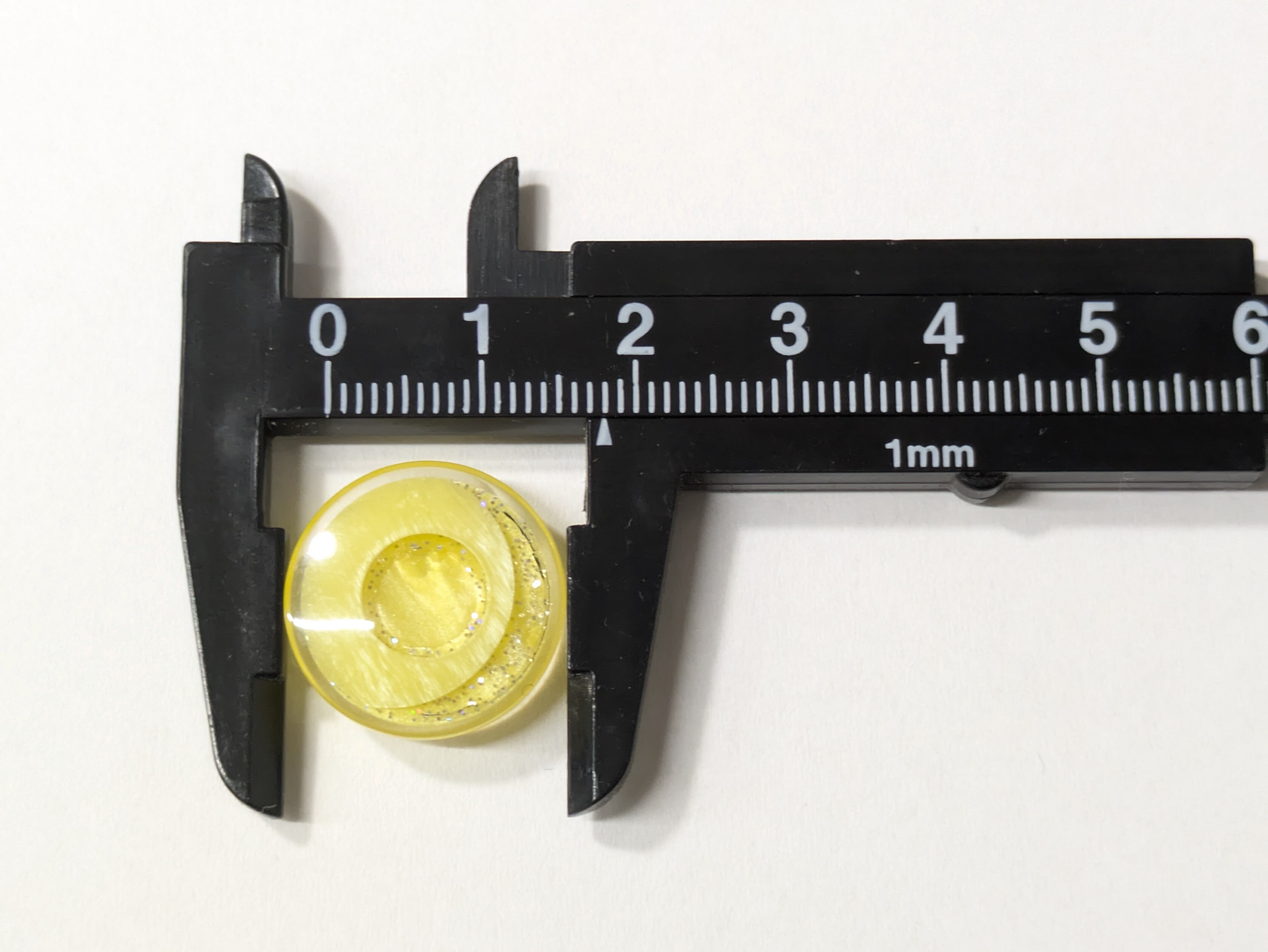 ※ぷっくりとした形状にラメ入りのイエローボタン。見ているだけで元気が出てくる、明るく楽しい印象を与えます!中央部の円形を囲むように、イエローとラメが織りなす美しい世界は、作品のアクセントとして最適です。