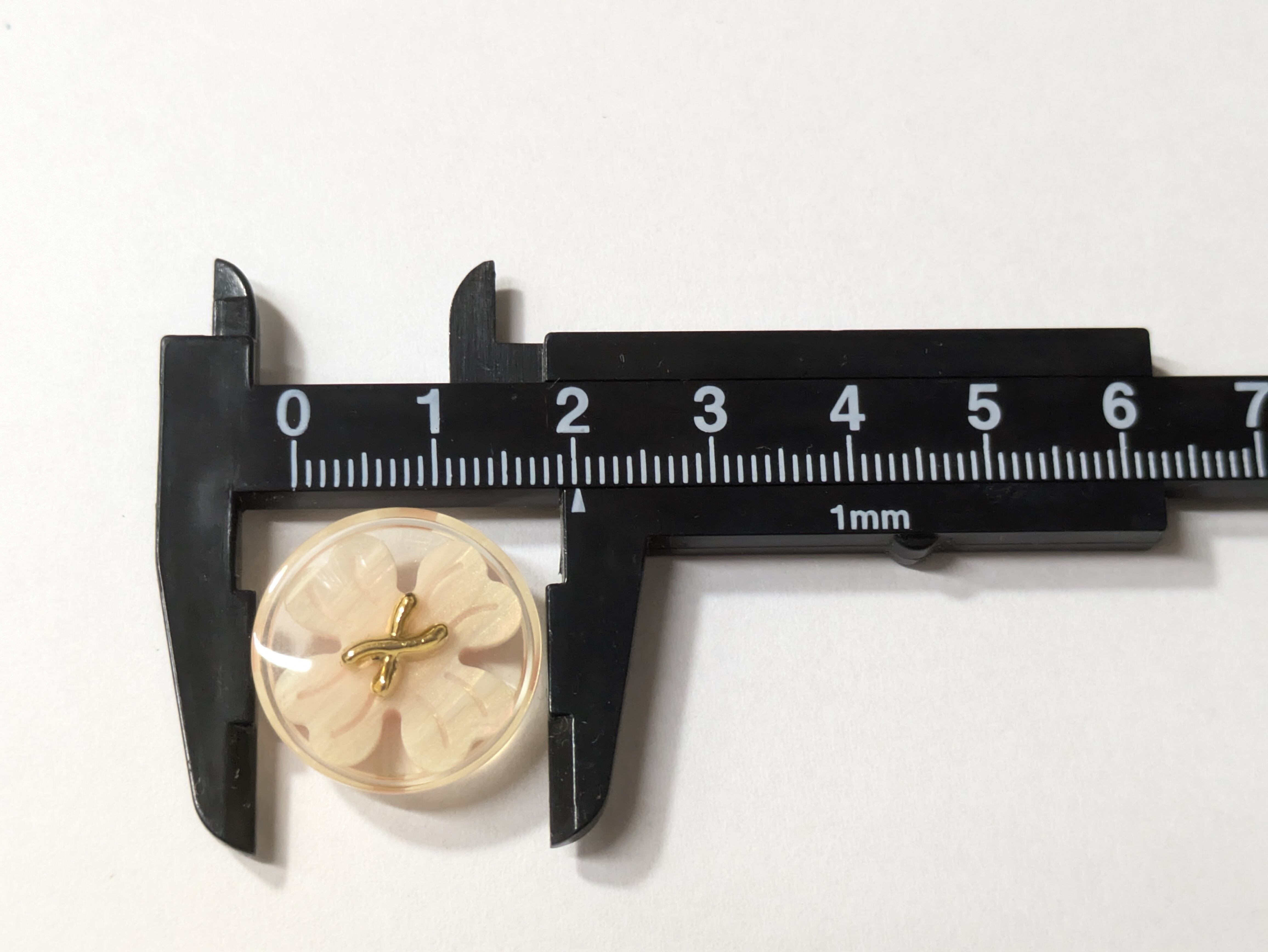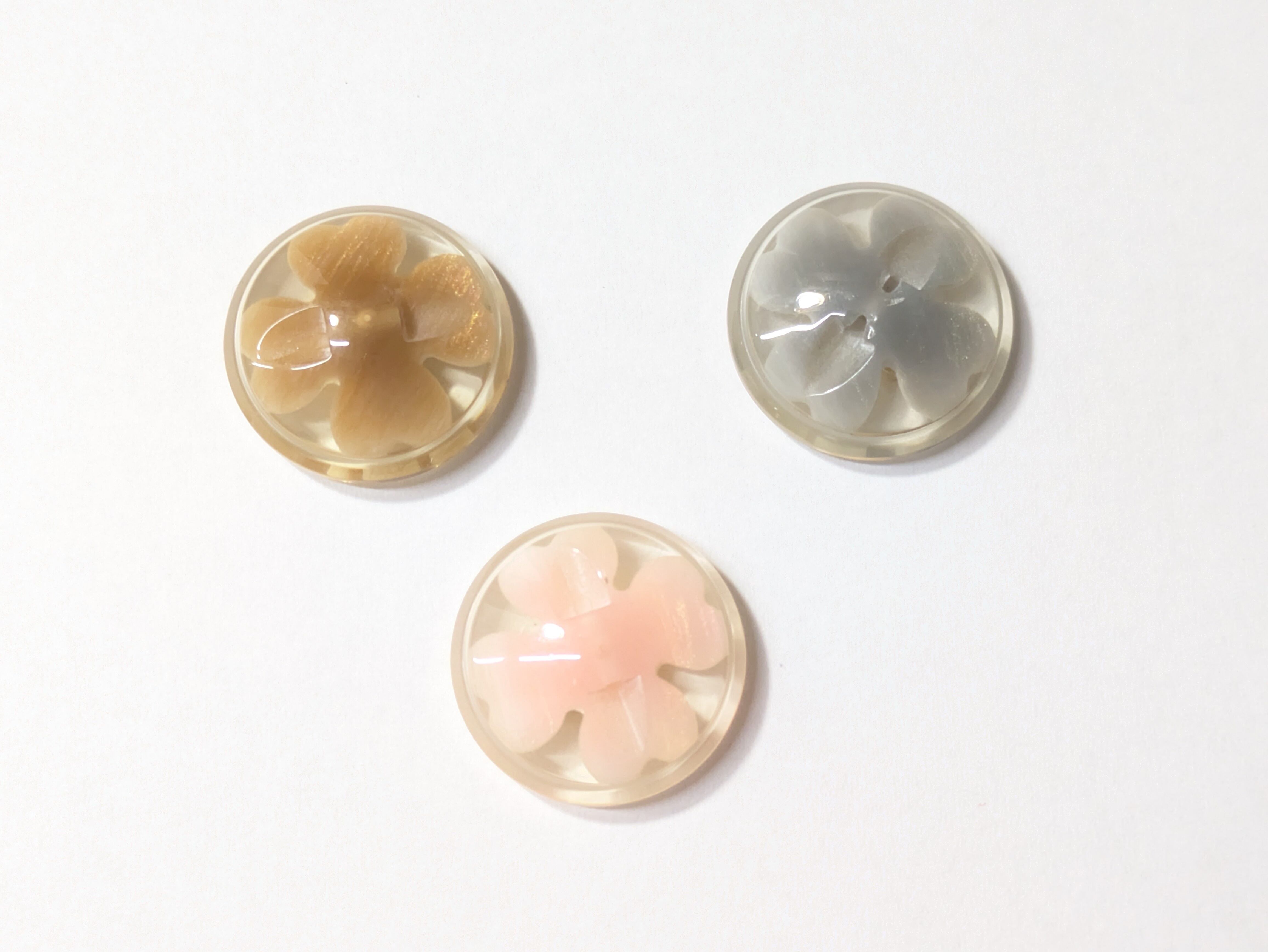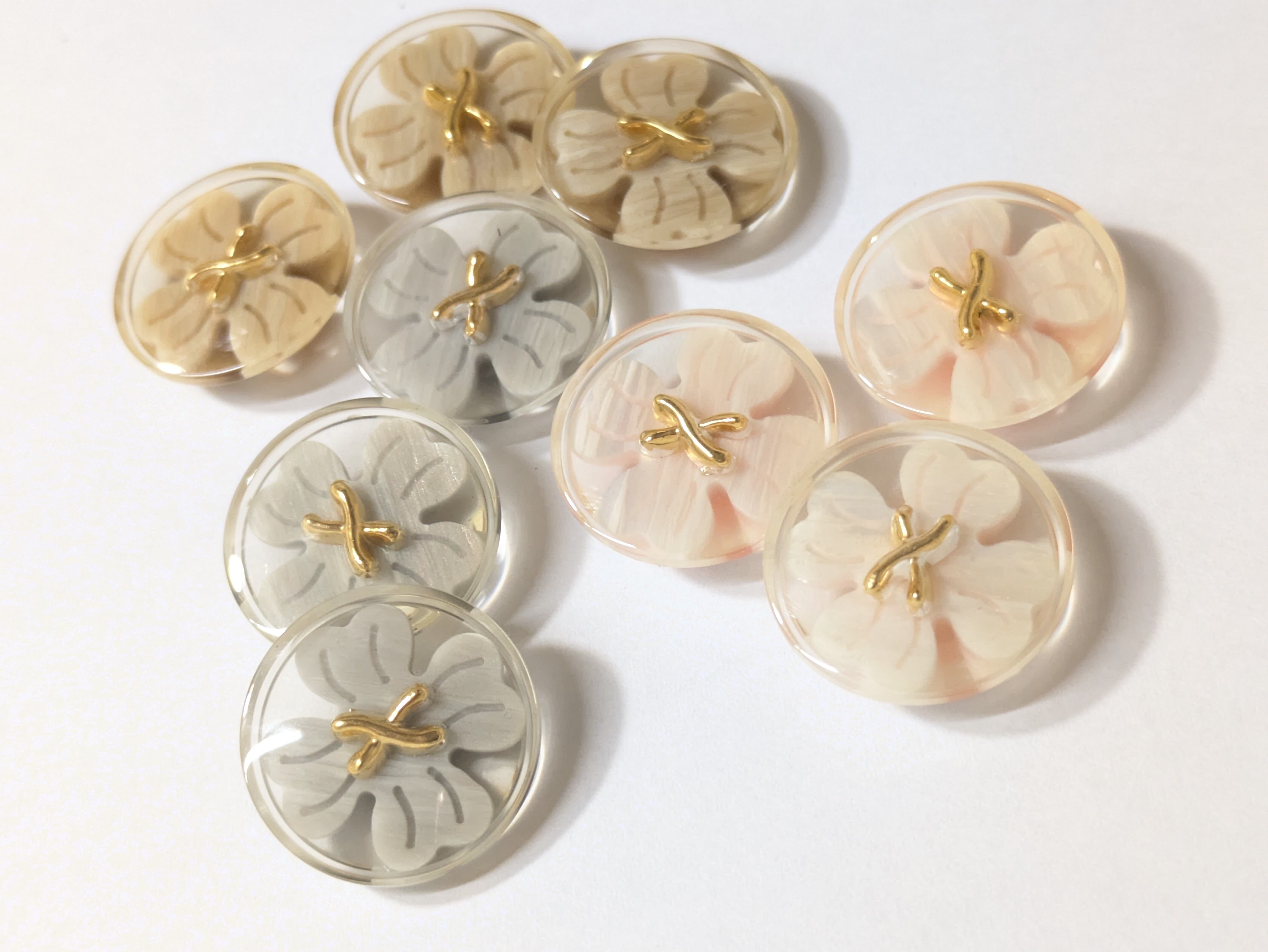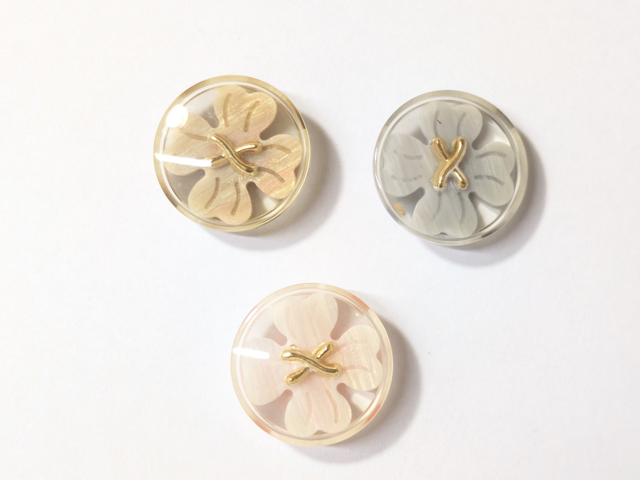 ※クリアベースに咲く淡い色合いのお花が特徴のボタンです。見る角度によってはオーロラ色が煌めき、さまざまな表情を見せる美しいデザインとなっています。中心にはクロスのゴールドパーツがアクセントとして輝きを加え、上品な印象を与えます。