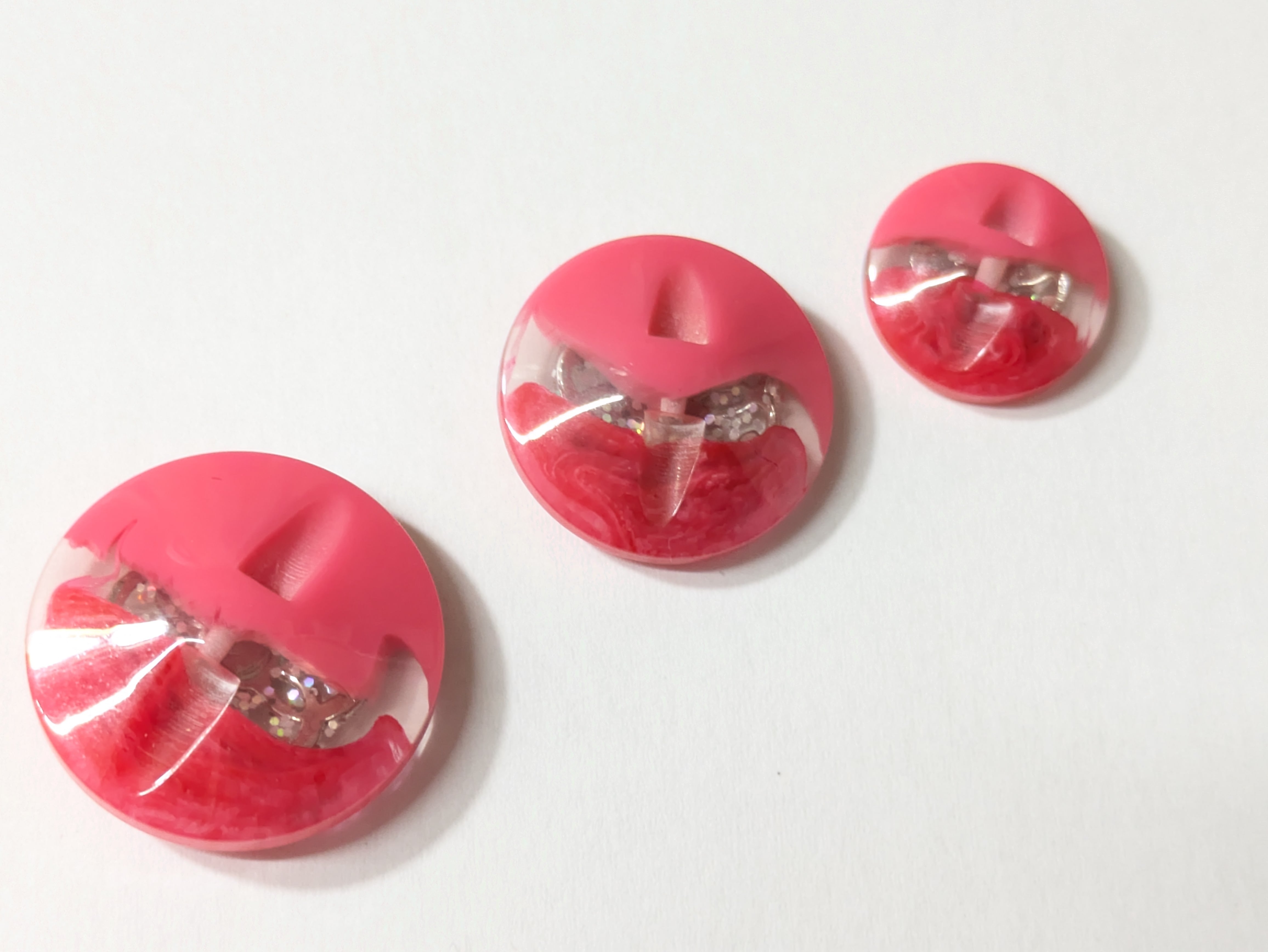 ※このボタンは、クリアな半分がまるで絵の具で塗られたような美しさを持ち、中心にはかわいらしい四葉のクローバーのようなパーツと、キラキラと輝くラメが施されています。お姫様のような華やかさを持つこのボタンは、夢のようなアクセントを添えます。