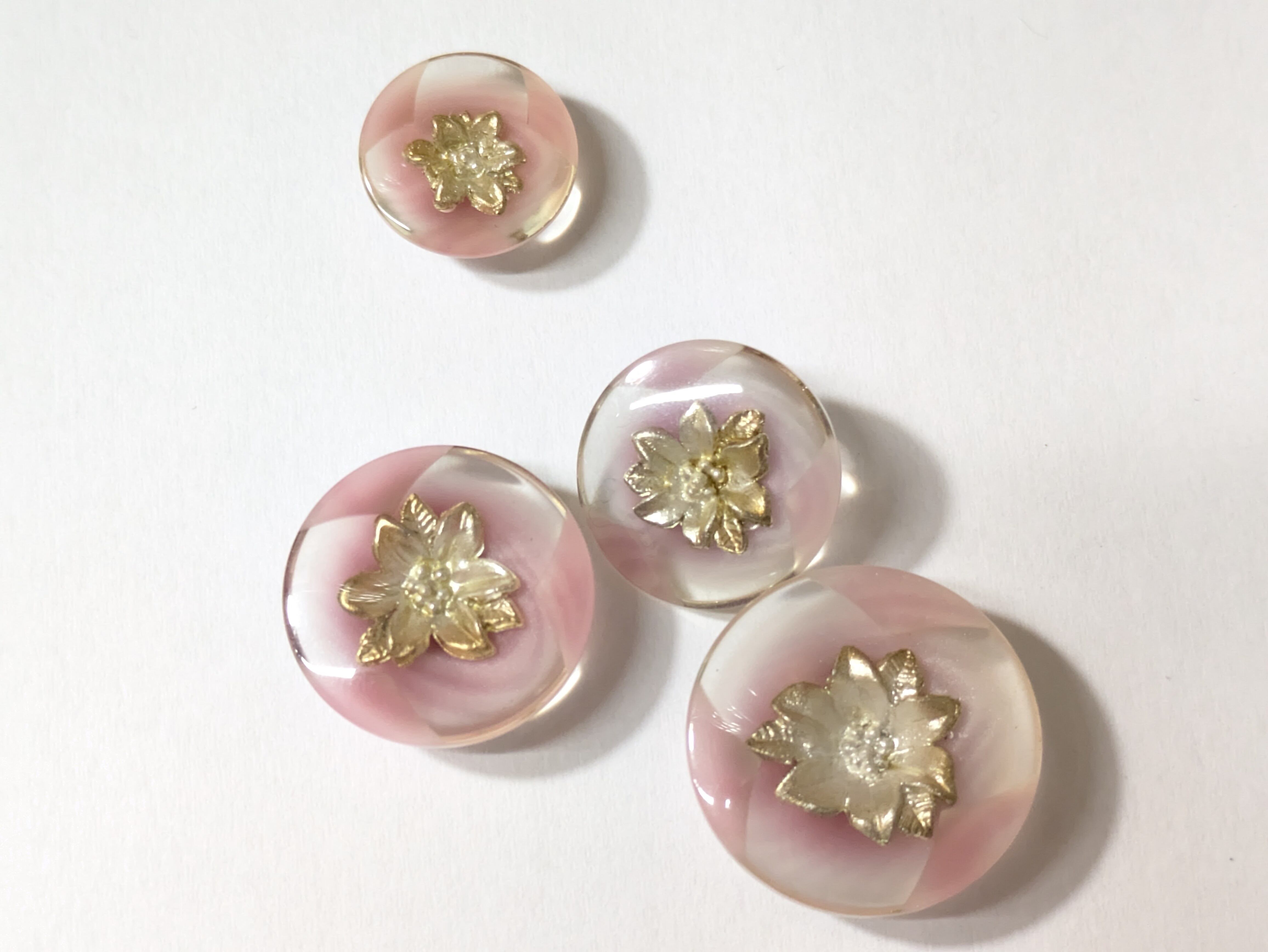 ※このボタンは、クリアな薄ピンクの中に、ゴールドパーツで作られた可愛らしいお花のデザインが施されています。優雅さと可愛らしさを兼ね備えたボタンは、特別で大切な人への思いが込められているようです。