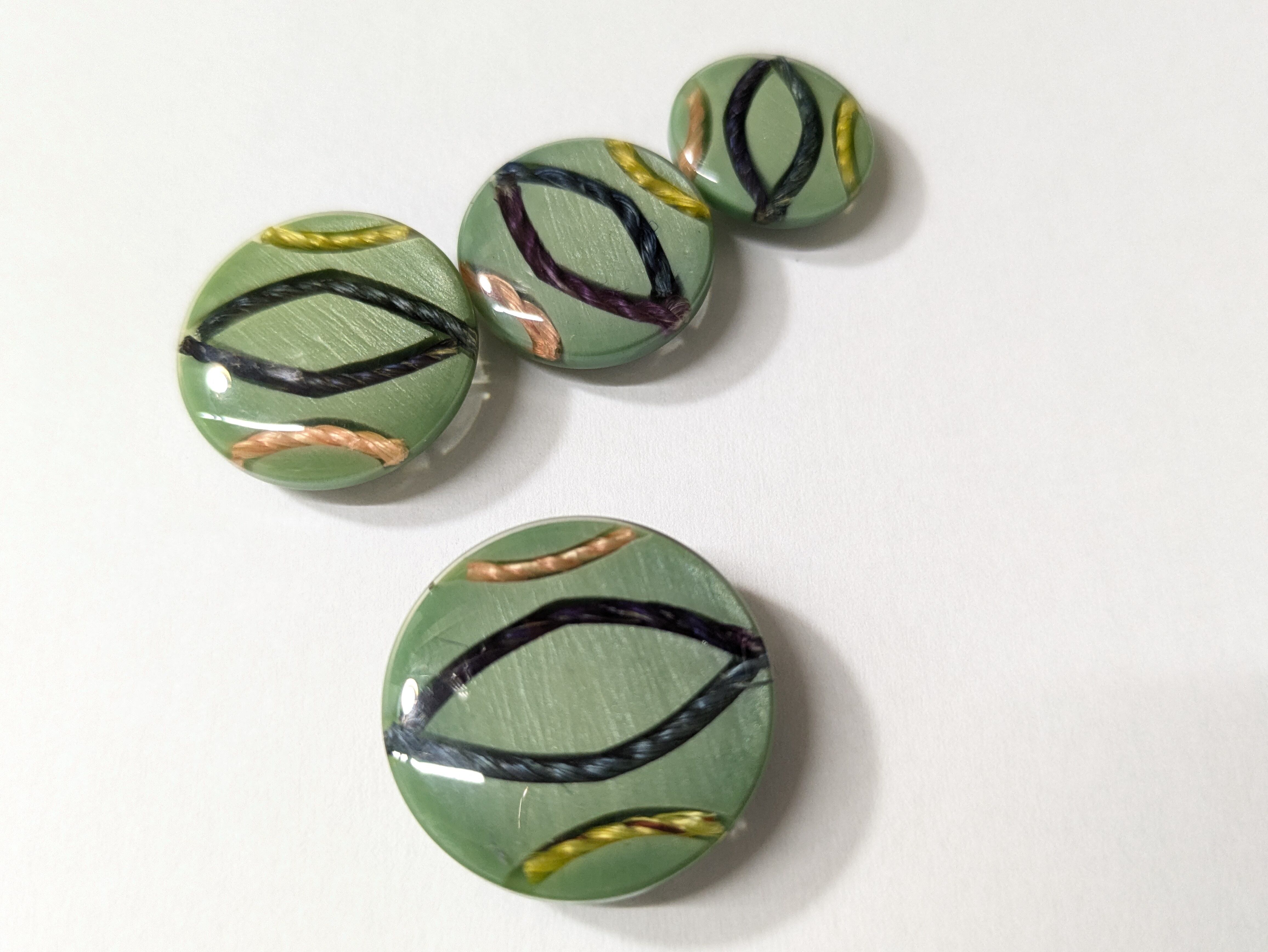 ※このボタンは、秋を感じさせる落ち着いたグリーンの中に、紺や茶系の縄模様が施されています。シックでありながら上品なデザインは、お洋服を引き立てるアクセントとなり、特別な日の装いにも日常使いにもぴったりです。