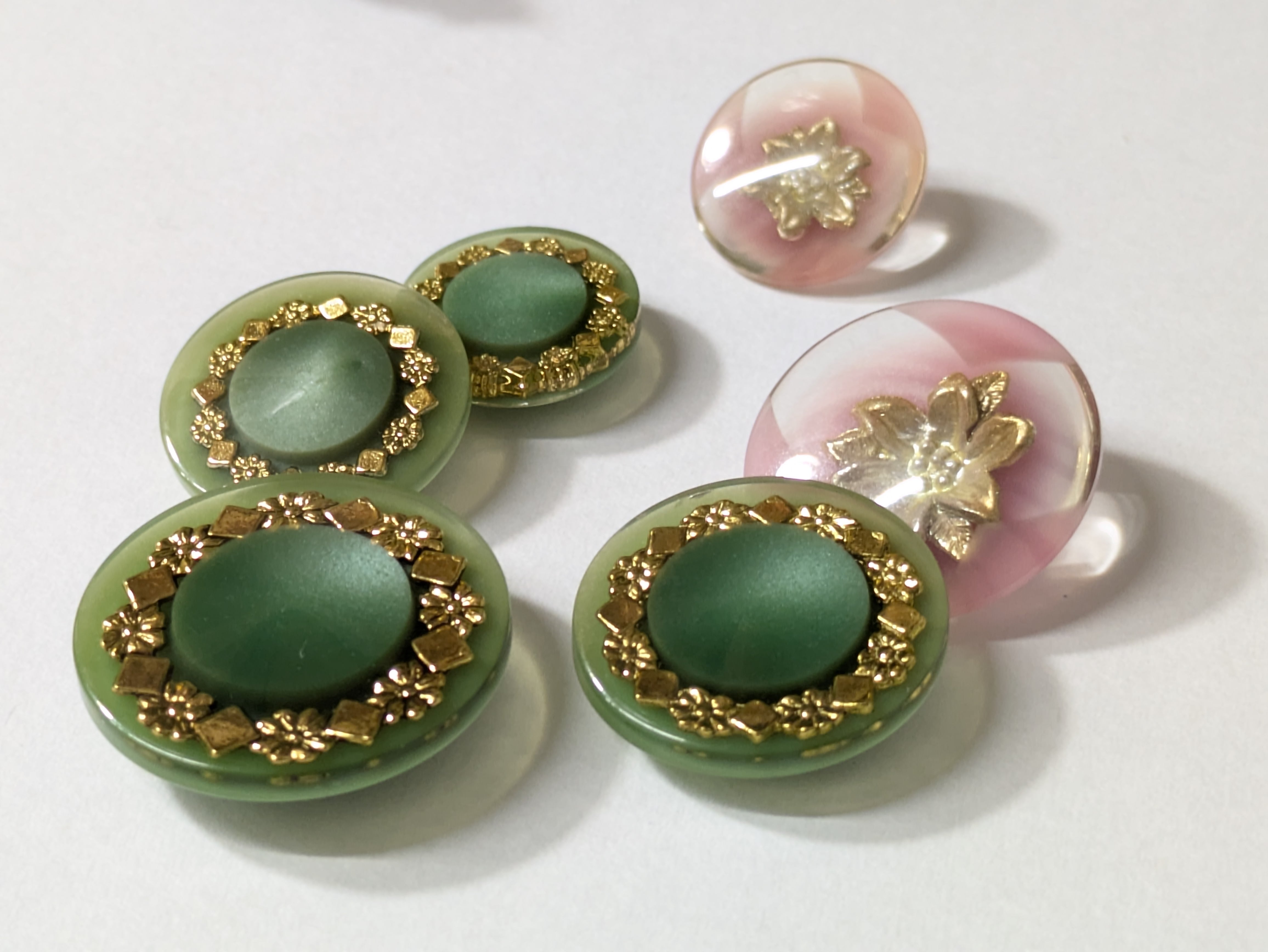 ※このボタンは、秋の深い色合いのグリーンが特徴で、見る角度によってボタンの一部が白っぽく見える神秘的なデザインです。また、ダイヤとお花であしらわれたゴールドリングが、お姫様のような可愛らしさを演出します。