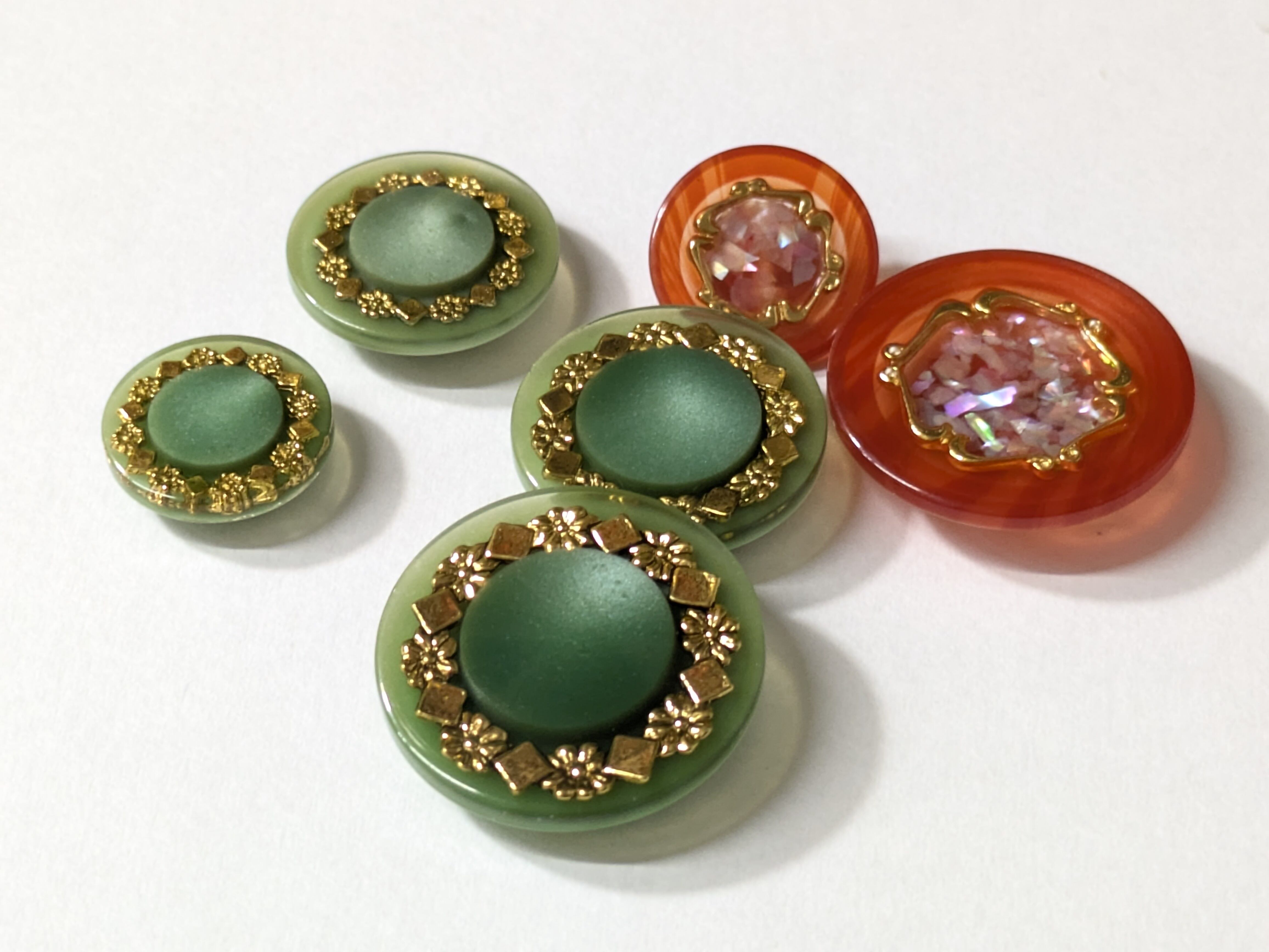 ※このボタンは、秋の深い色合いのグリーンが特徴で、見る角度によってボタンの一部が白っぽく見える神秘的なデザインです。また、ダイヤとお花であしらわれたゴールドリングが、お姫様のような可愛らしさを演出します。
