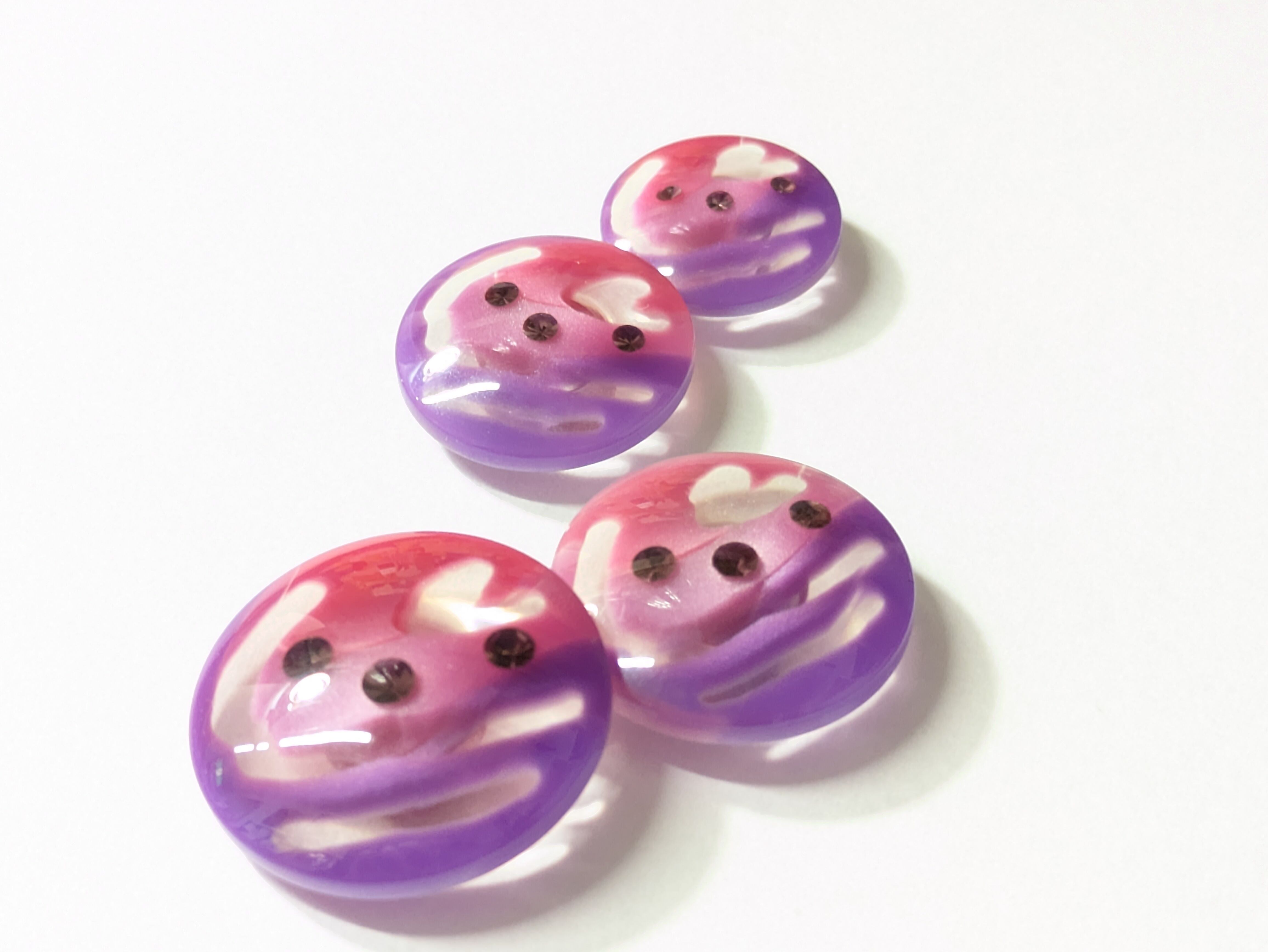 ※このボタンは、クリアベースに美しいグラデーションが施された色合いが特徴です。ラインストーンが輝き、ハートのようなデザインのクリア部分がキュートさを引き立てます。