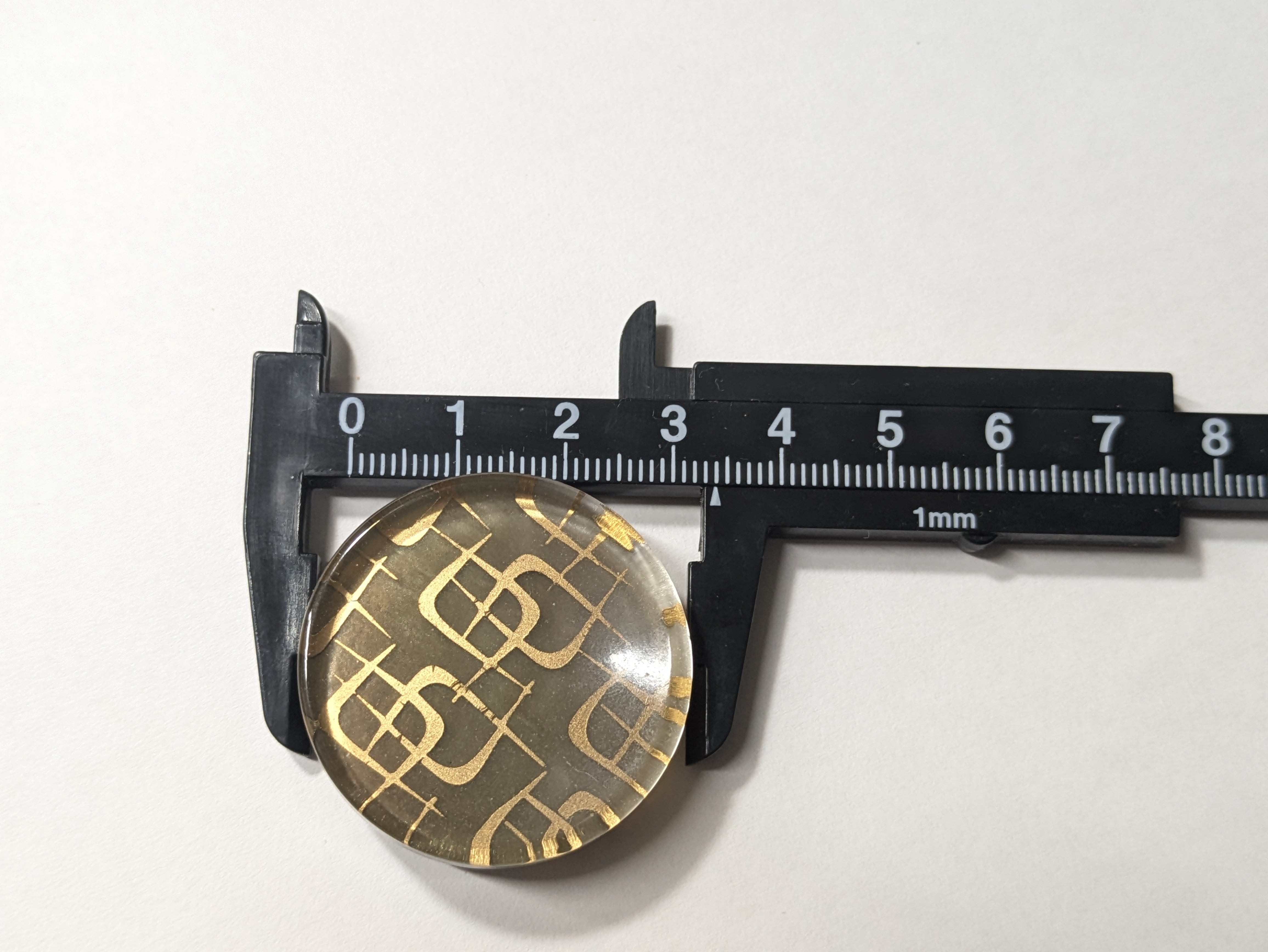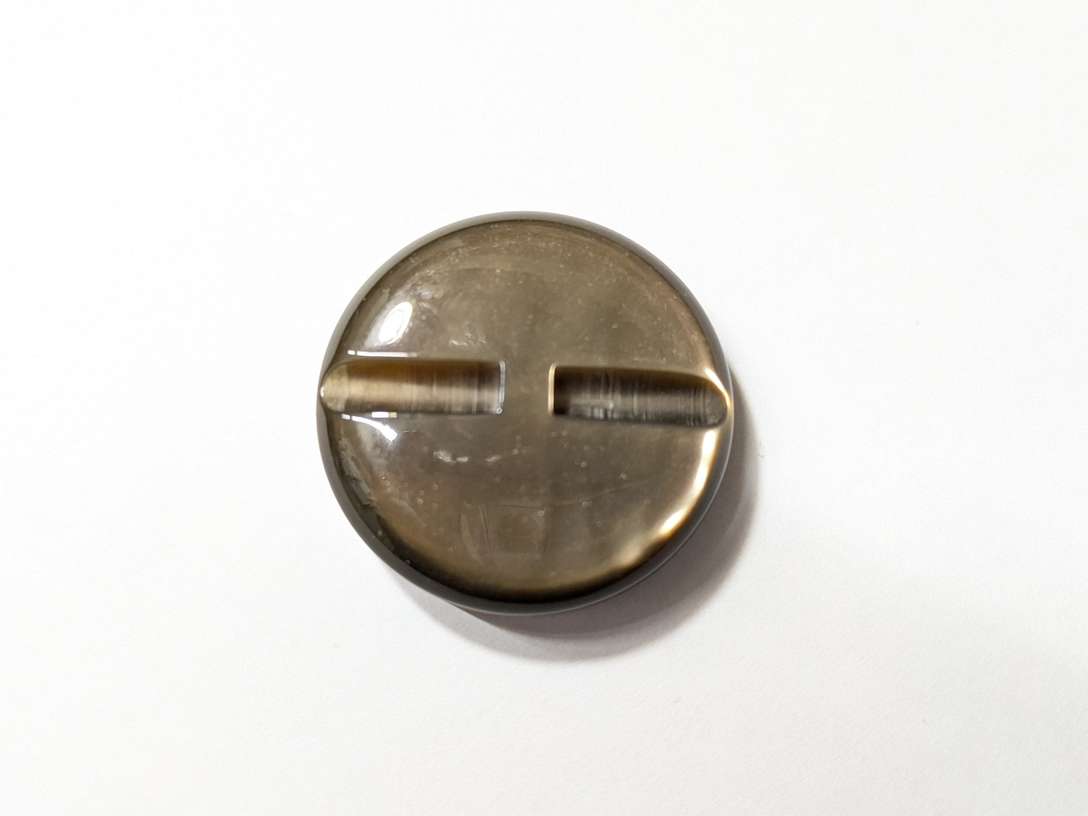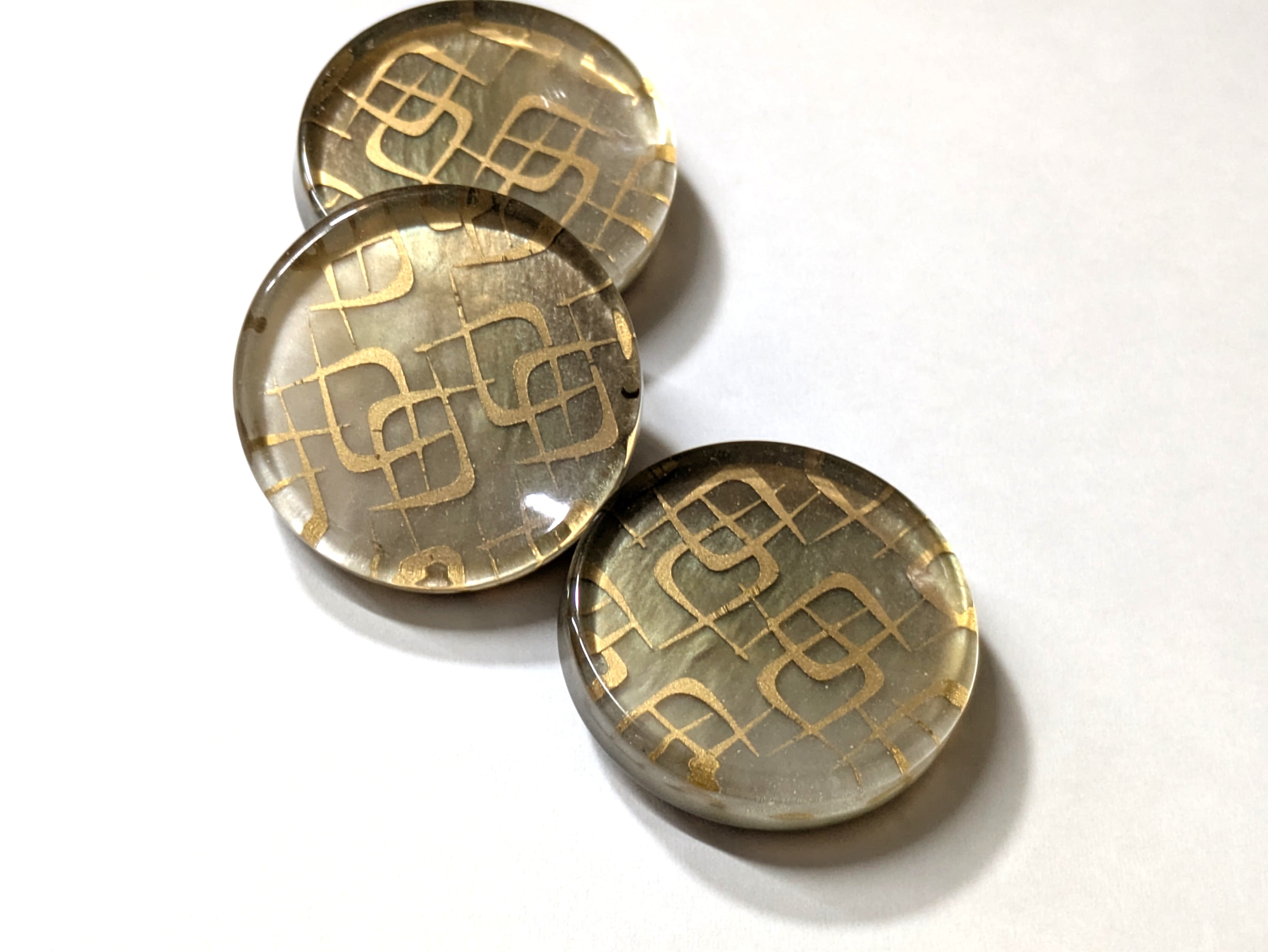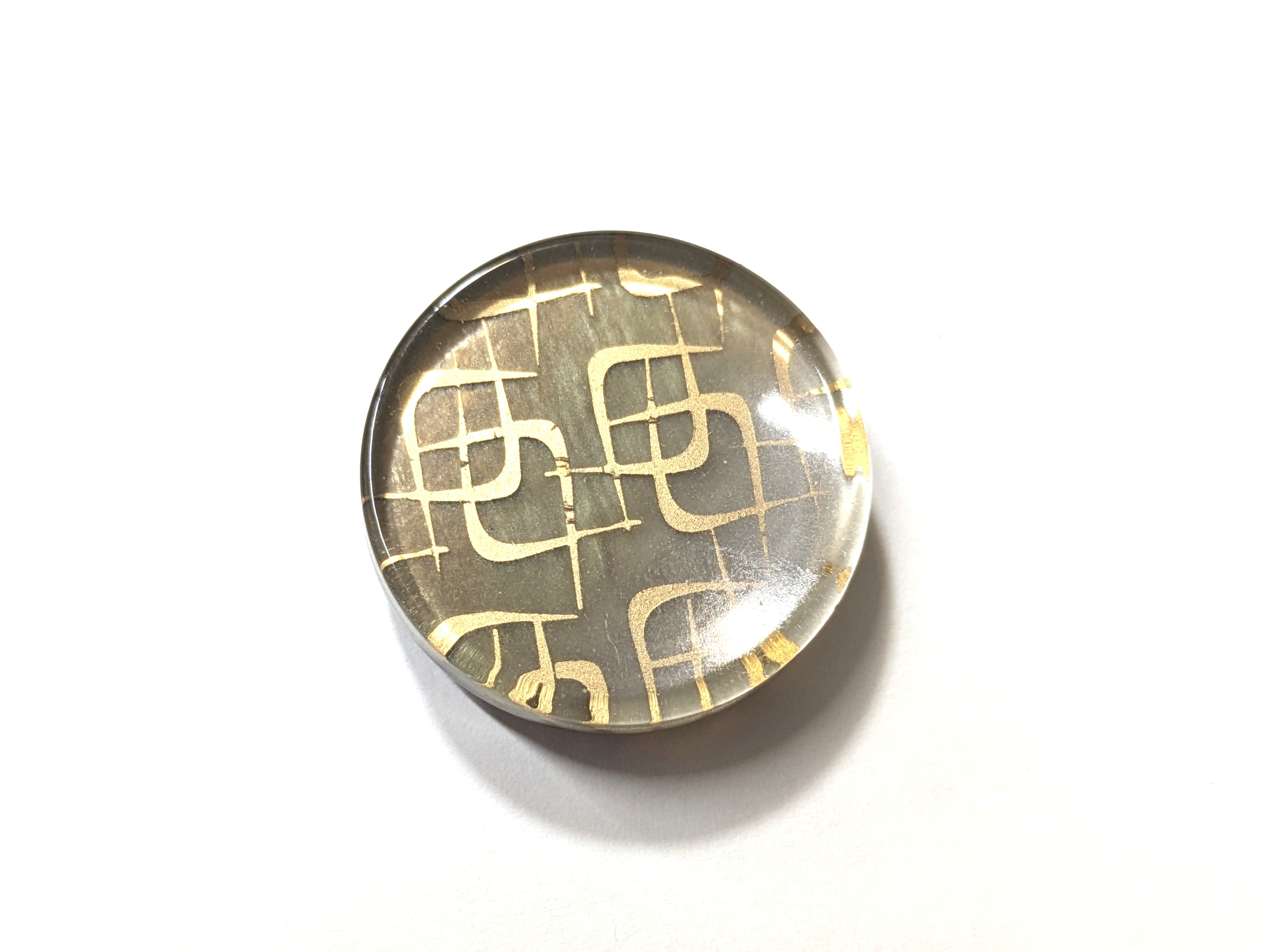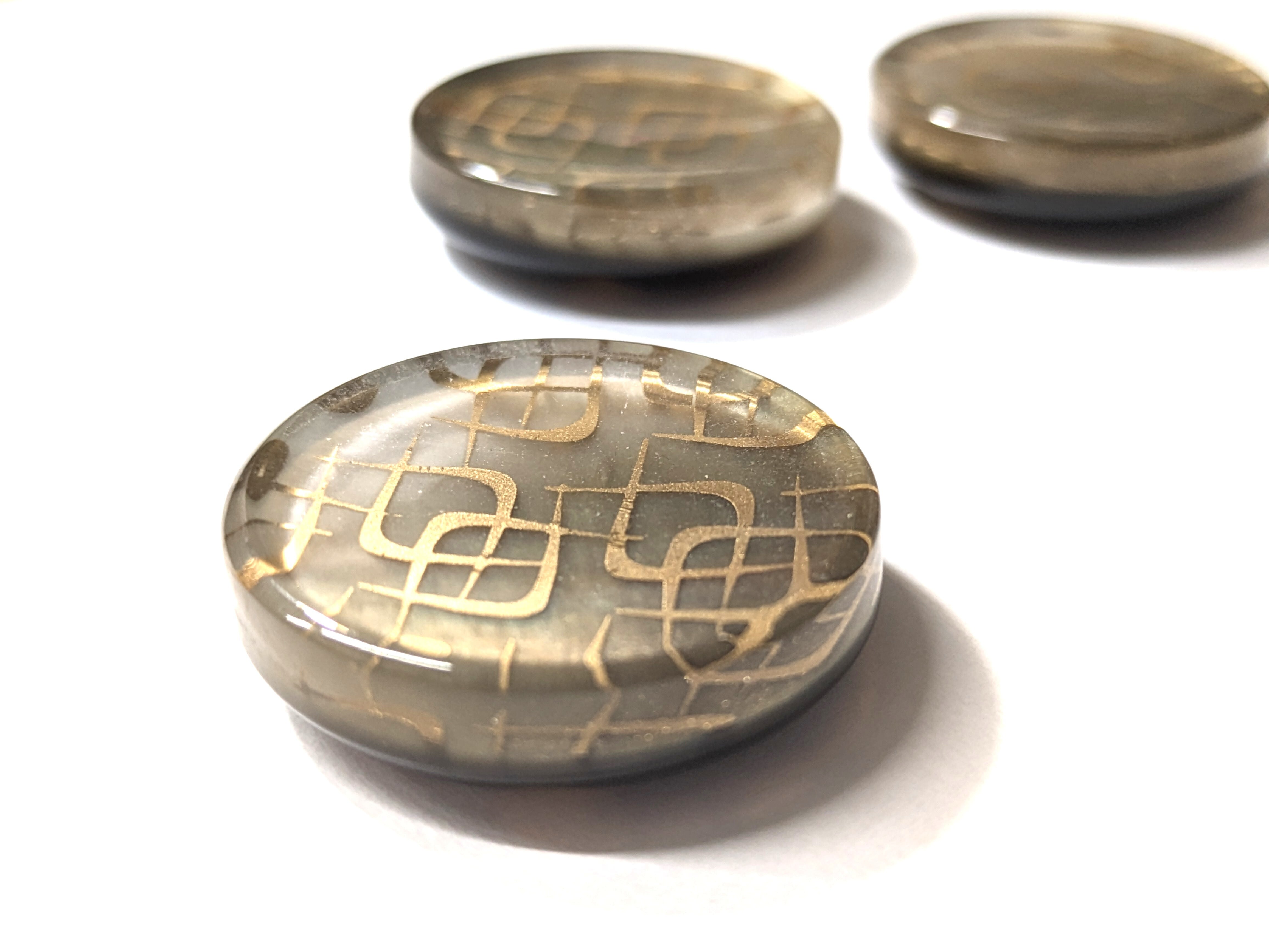 ※大きく厚みのあるデザインが特徴のItaly buttonです。ボタン表面には、ゴールドで描かれた迷路のような模様が施されており、特別なアクセントを加えてくれます。滑らかな手触りとしっかりとした存在感が、コートなどのアウターにピッタリです。