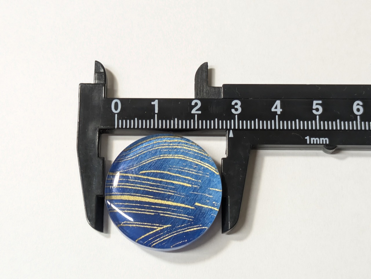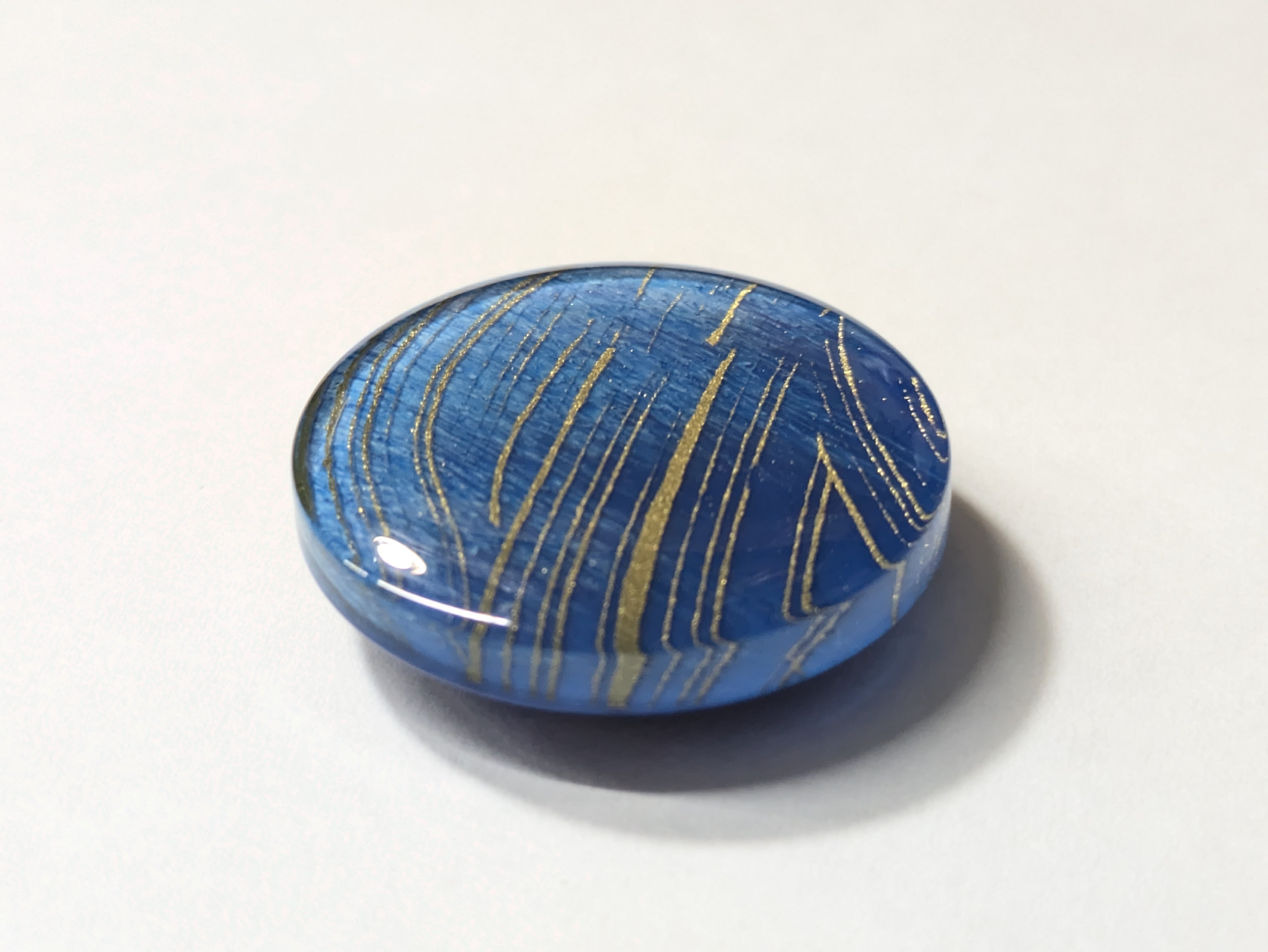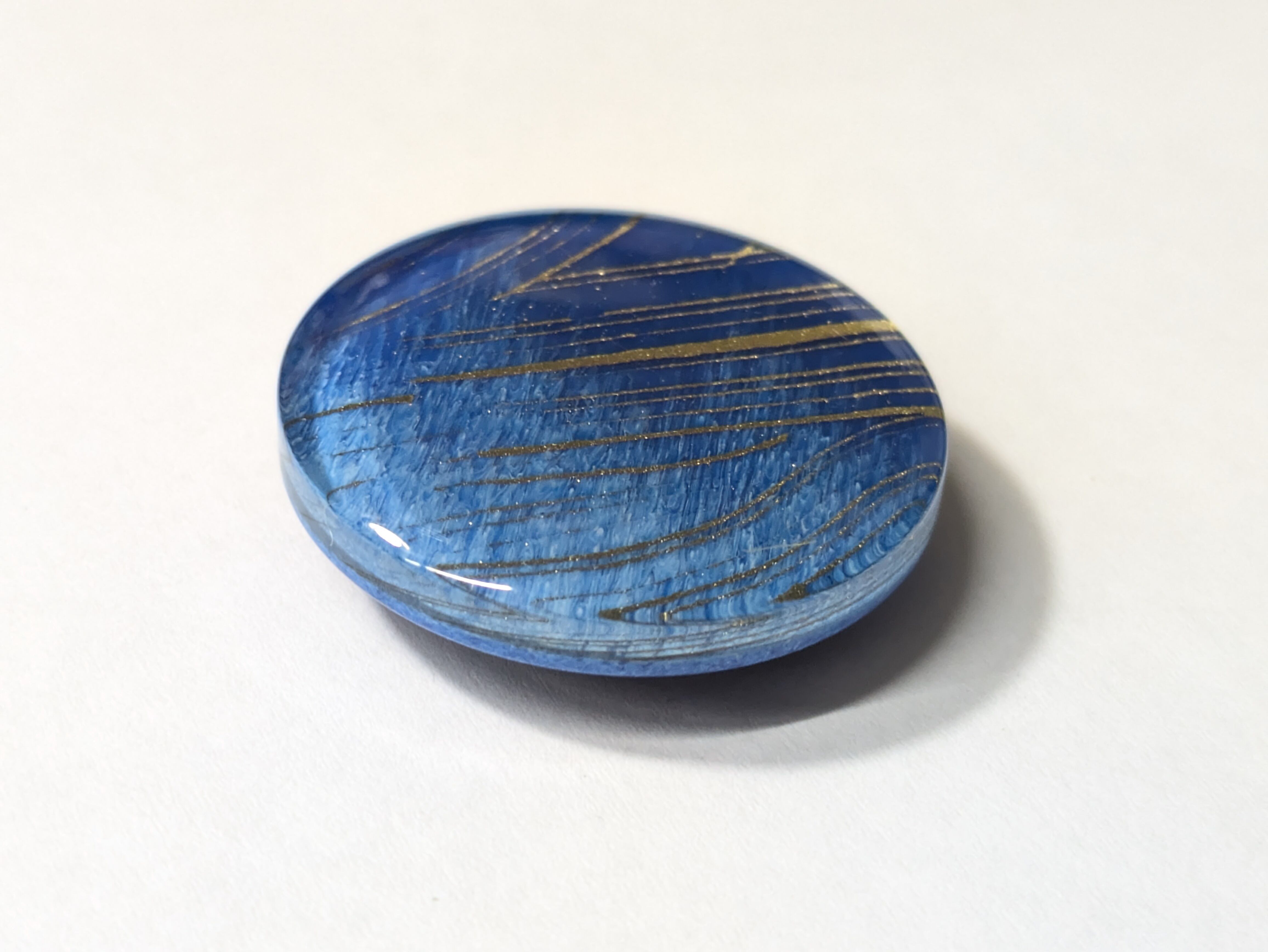 ※冬の寒い空の美しさを表現した、濃いブルーから薄いブルーへのグラデーションが魅力的なボタンです。細やかなゴールドの模様が優雅な表情を添えます。表面はクリアコーティングされており、一層美しさを際立たせています。