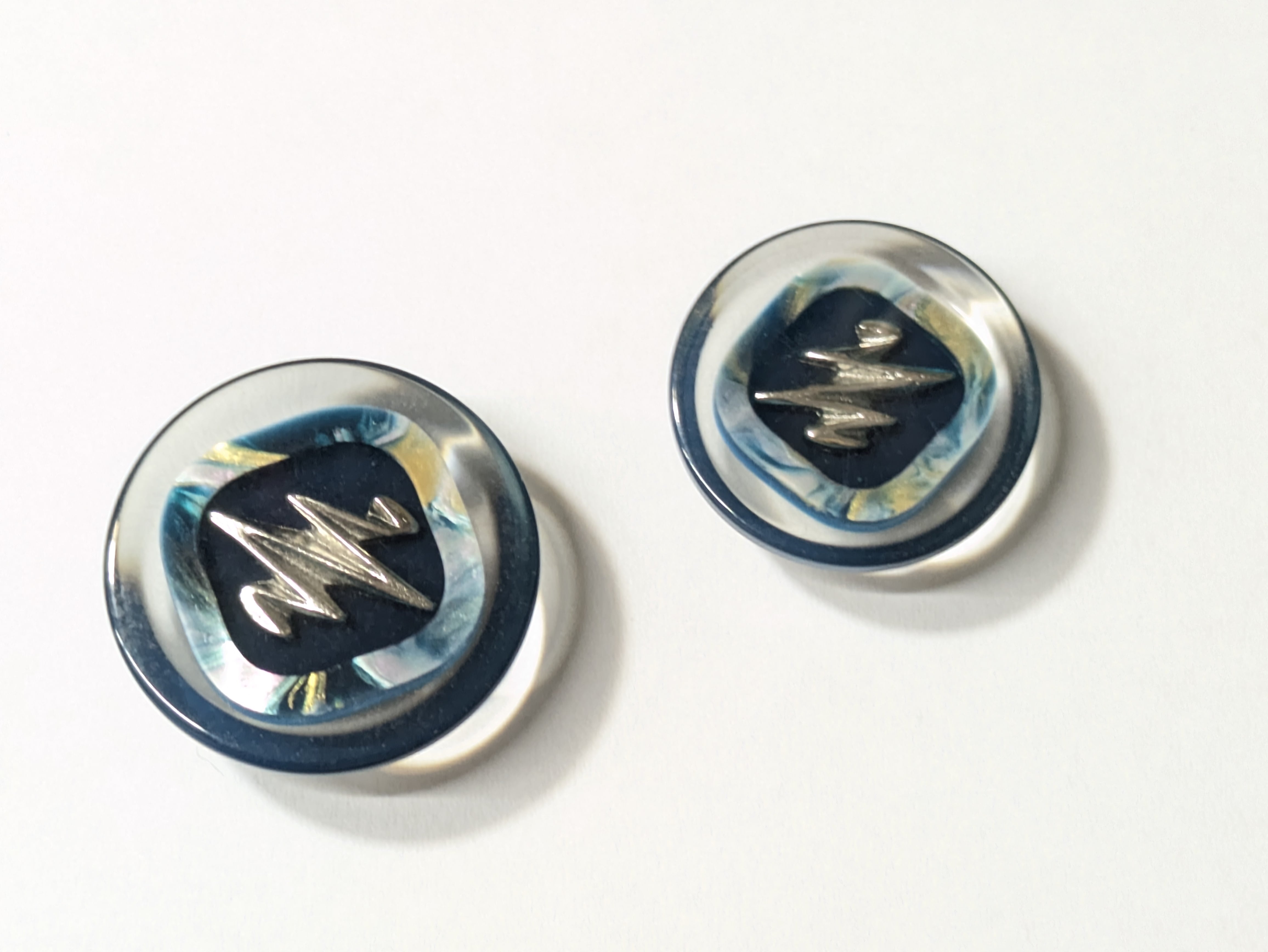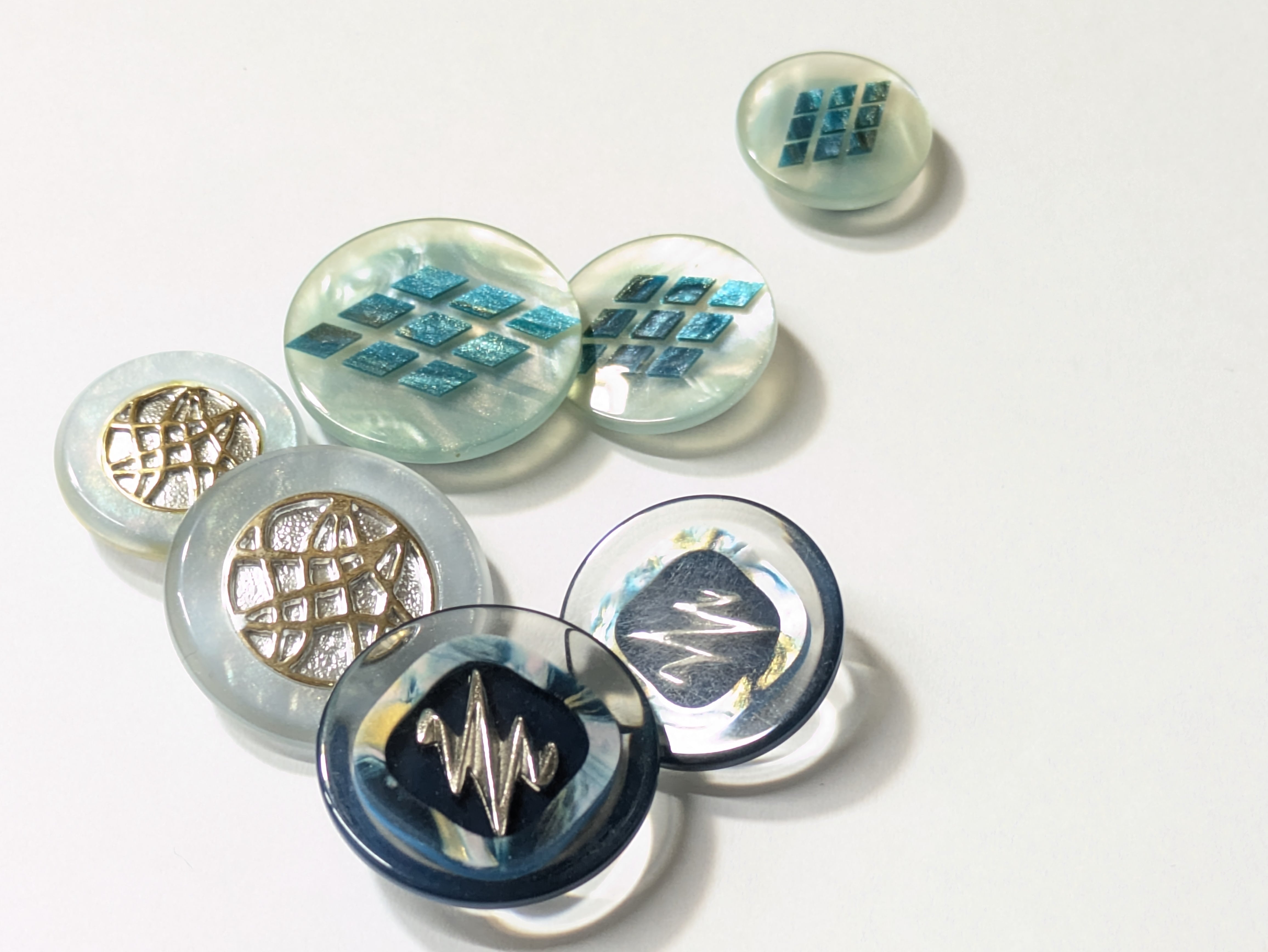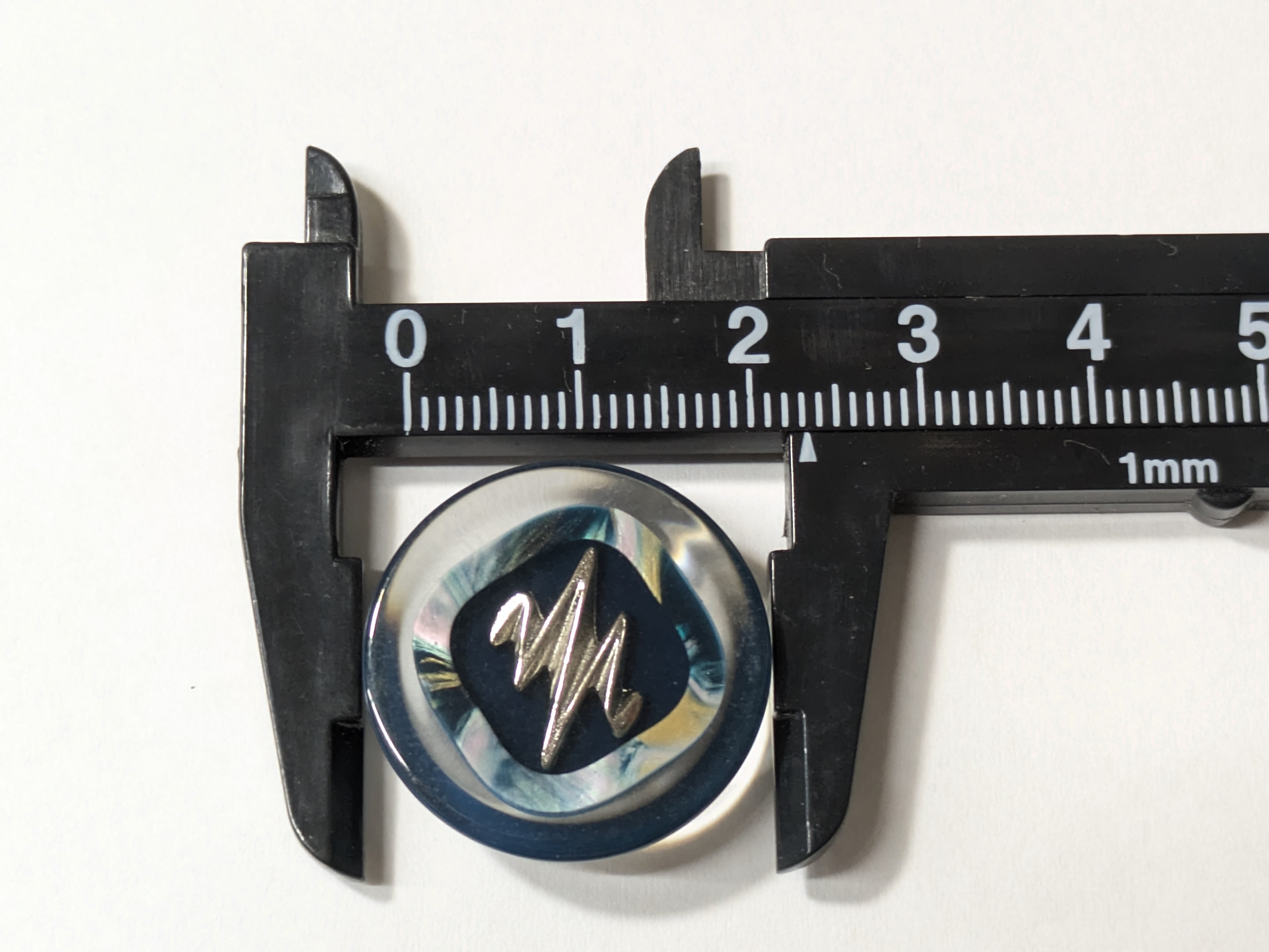 ※紺色にシルバーパーツがあしらわれ、周囲にはシェル風パーツが施された美しいデザインのボタンです。クリアカバーが施され、まるで氷の中に閉じ込められたような幻想的な雰囲気を醸し出しています。
