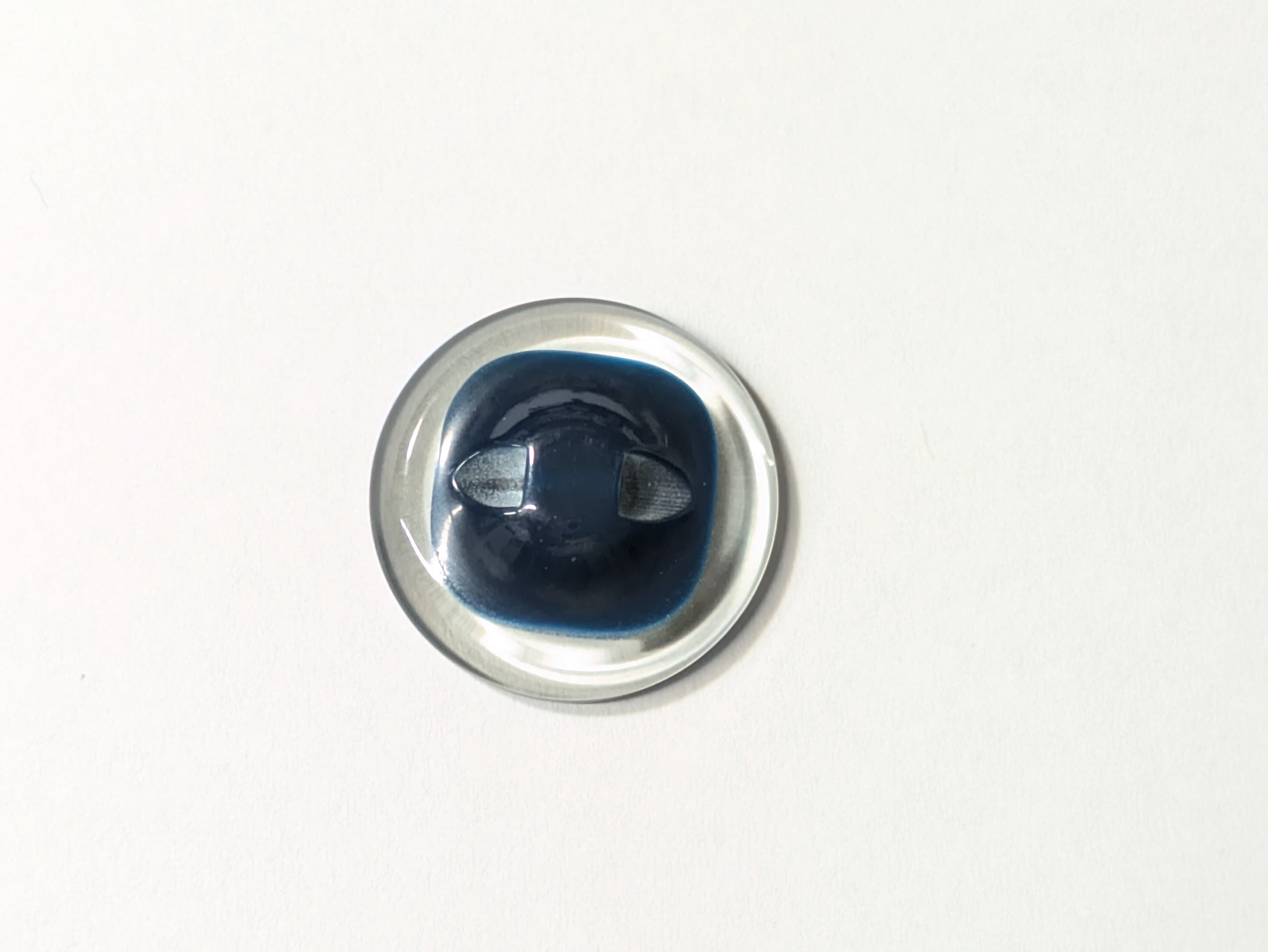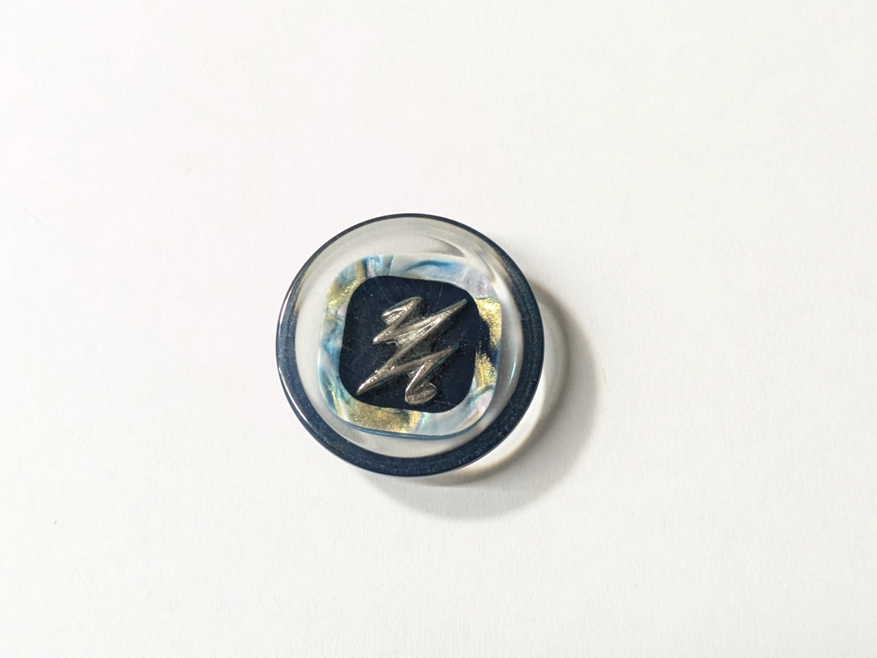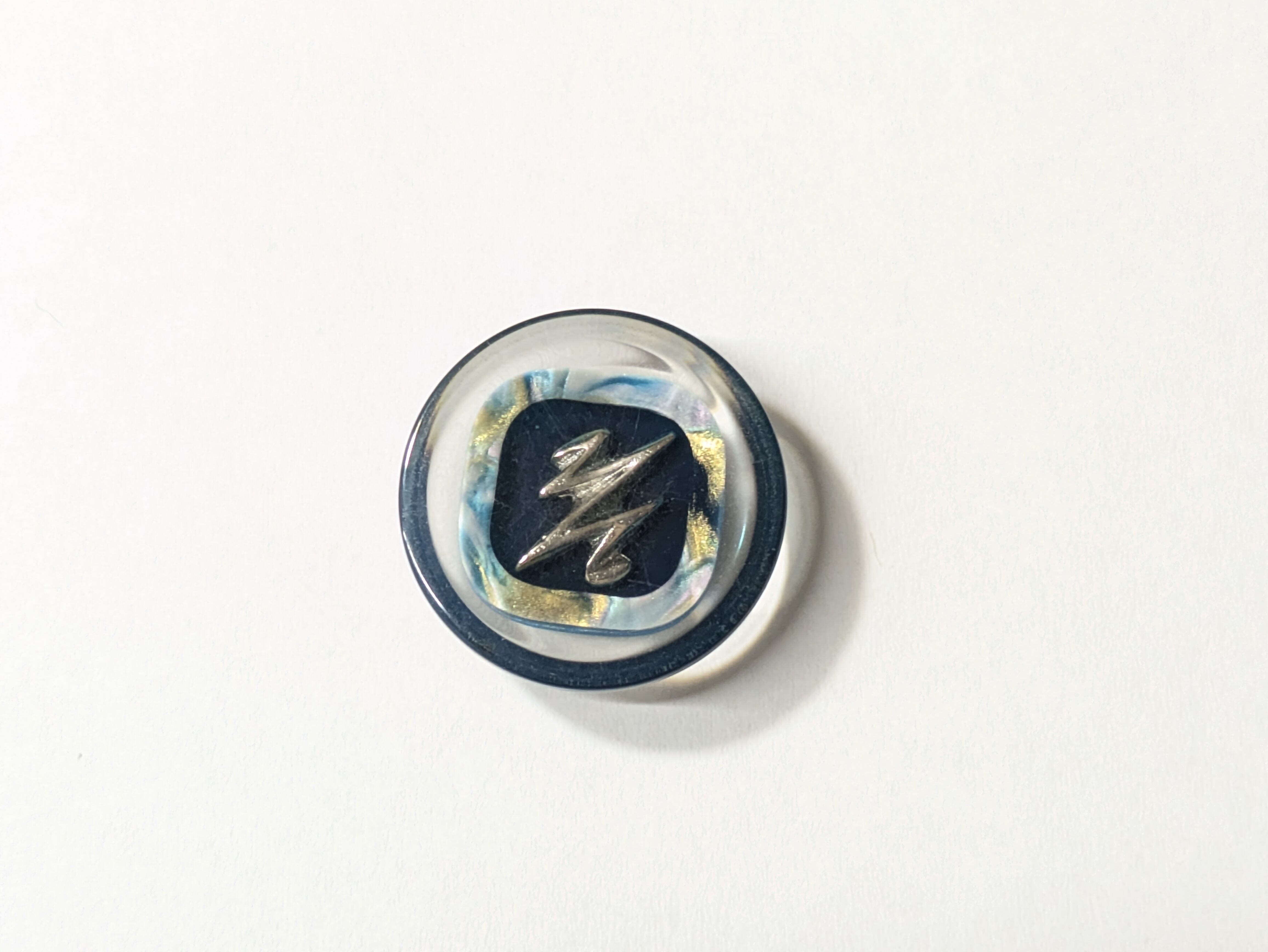 ※紺色にシルバーパーツがあしらわれ、周囲にはシェル風パーツが施された美しいデザインのボタンです。クリアカバーが施され、まるで氷の中に閉じ込められたような幻想的な雰囲気を醸し出しています。