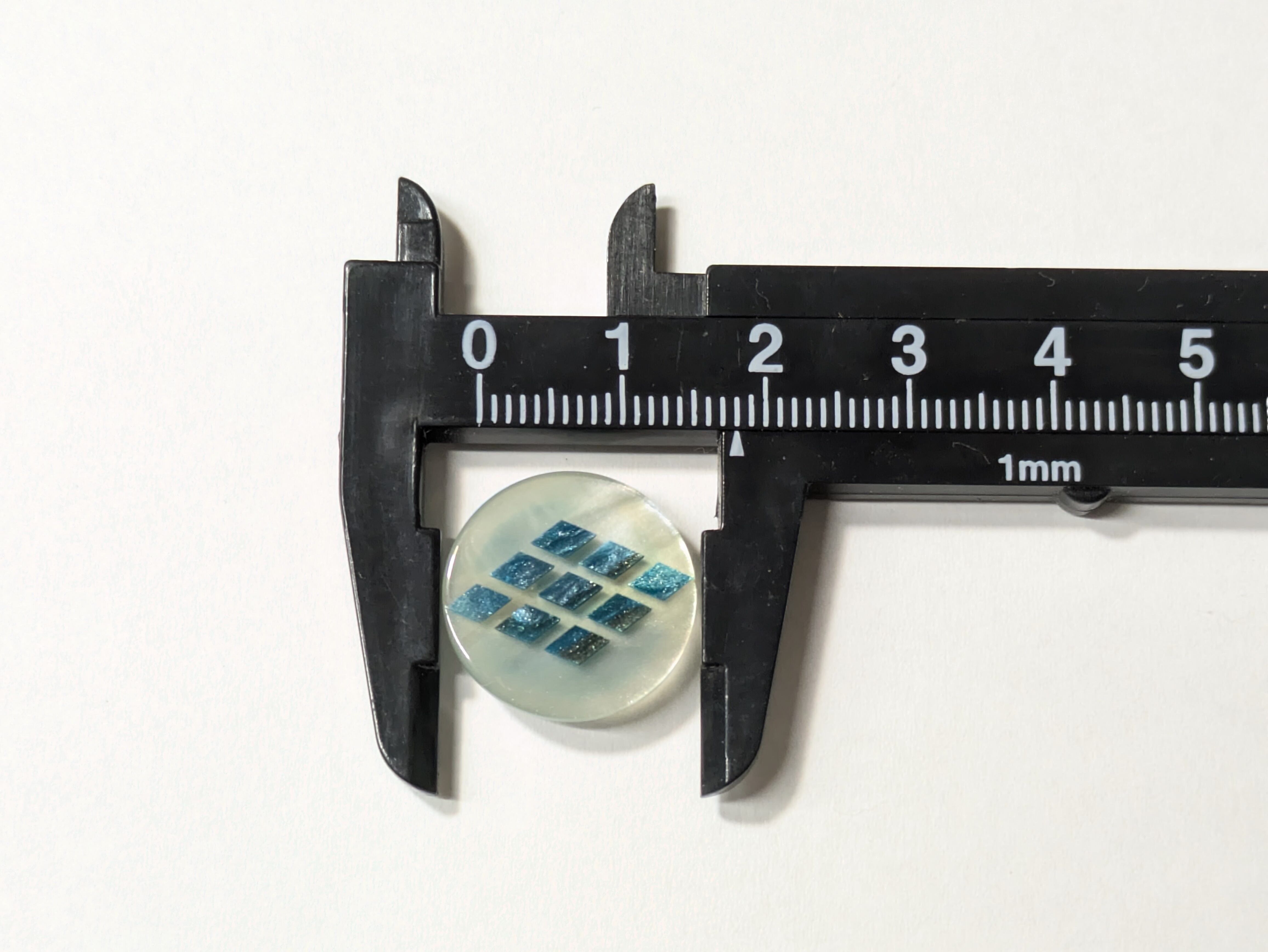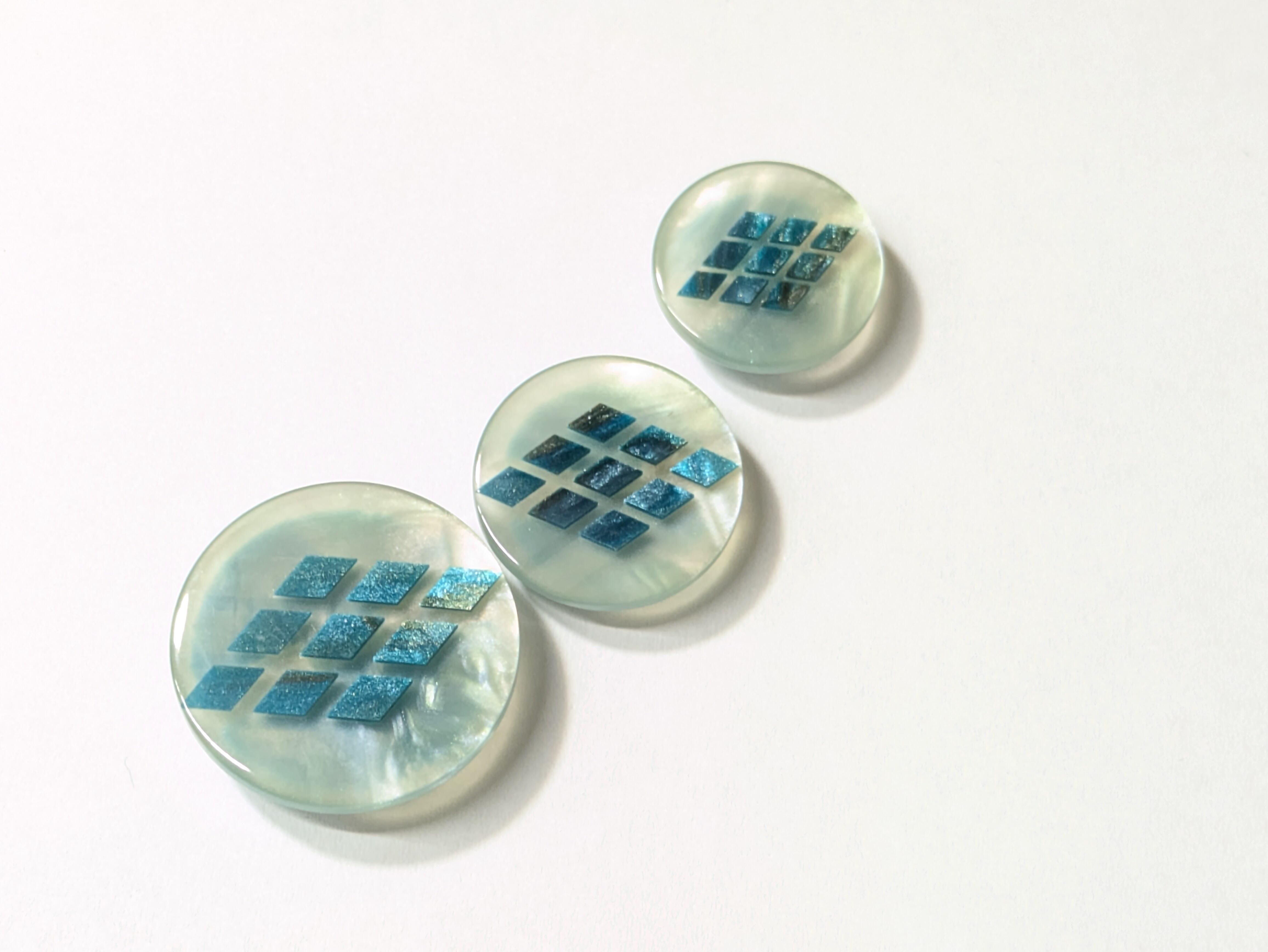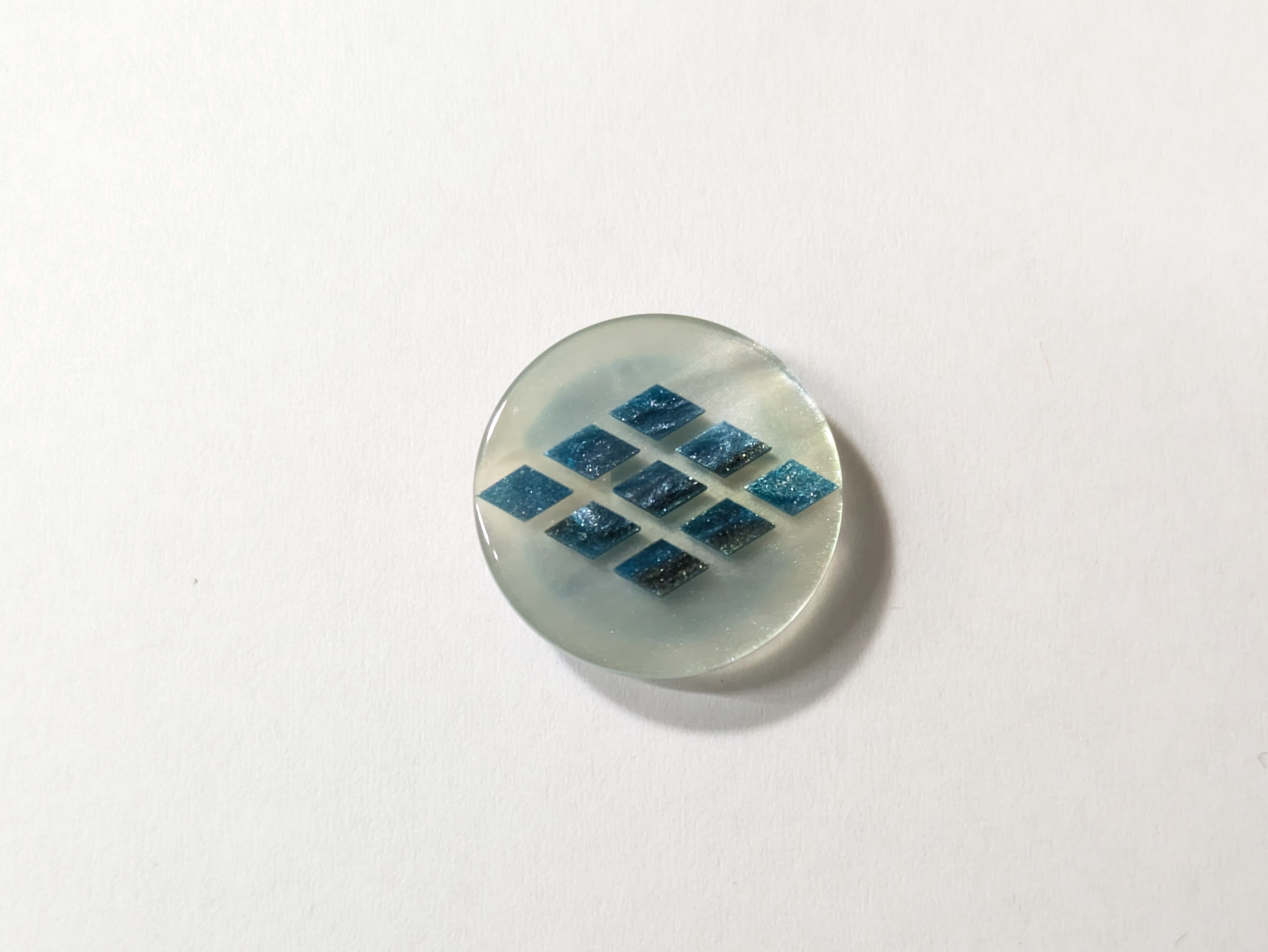 ※とても薄いグリーンに青緑のひし形模様が9個並んでいるシンプルながらも幻想的なデザインのボタンです。どこか夢の中へ引き込まれそうな魅力があり、コーディネートに特別なアクセントを加えるアイテムとしておすすめです。
