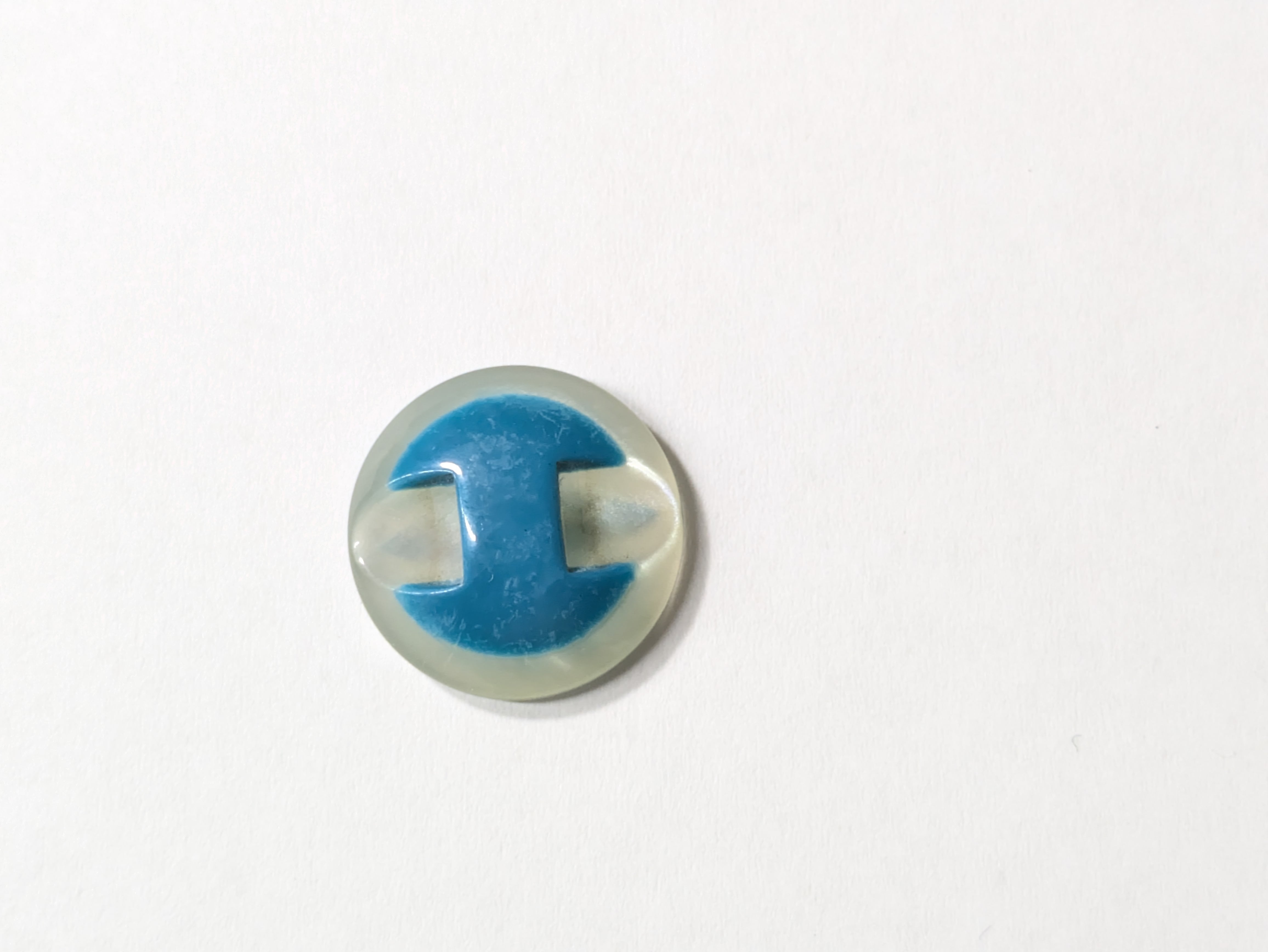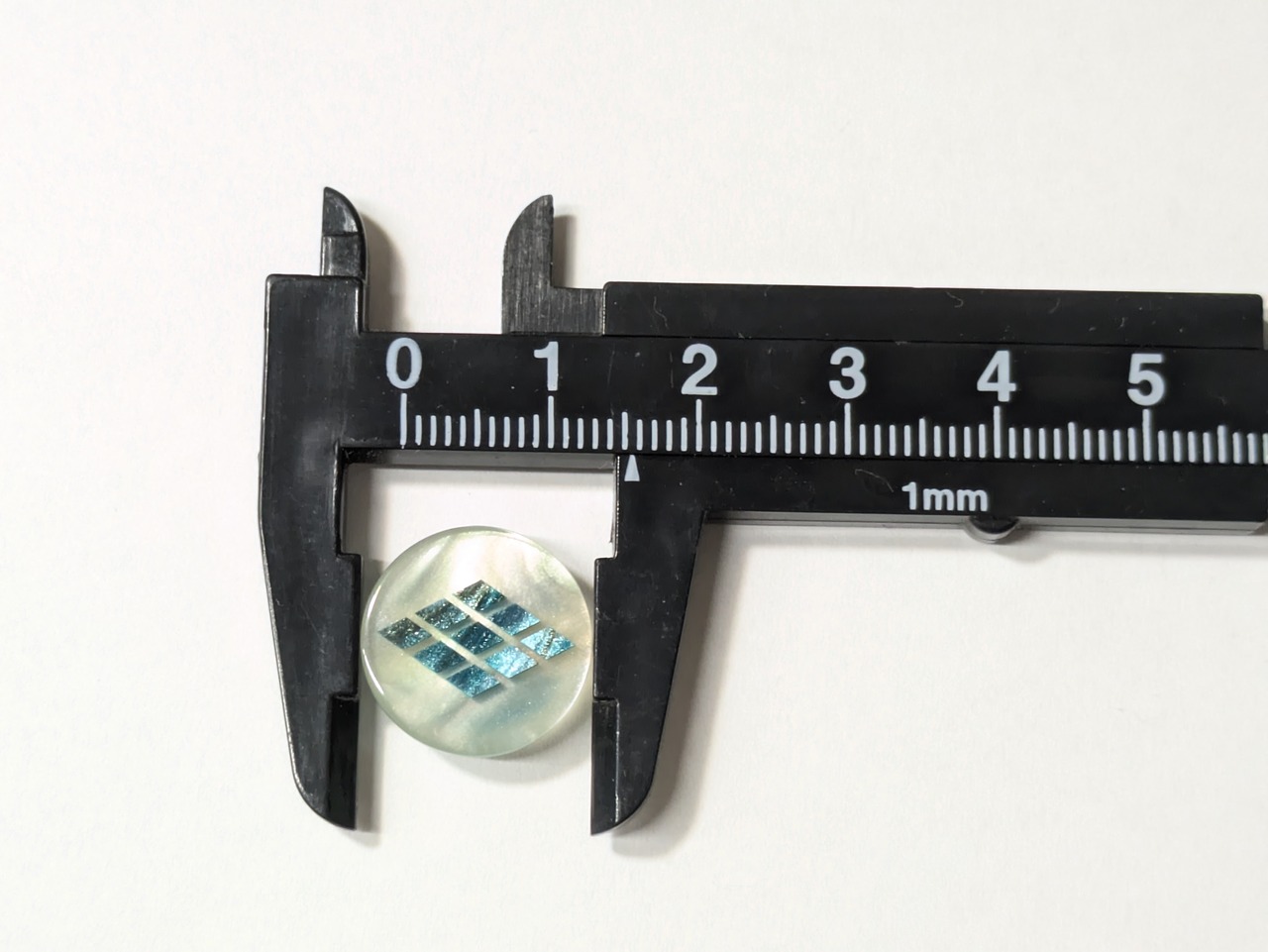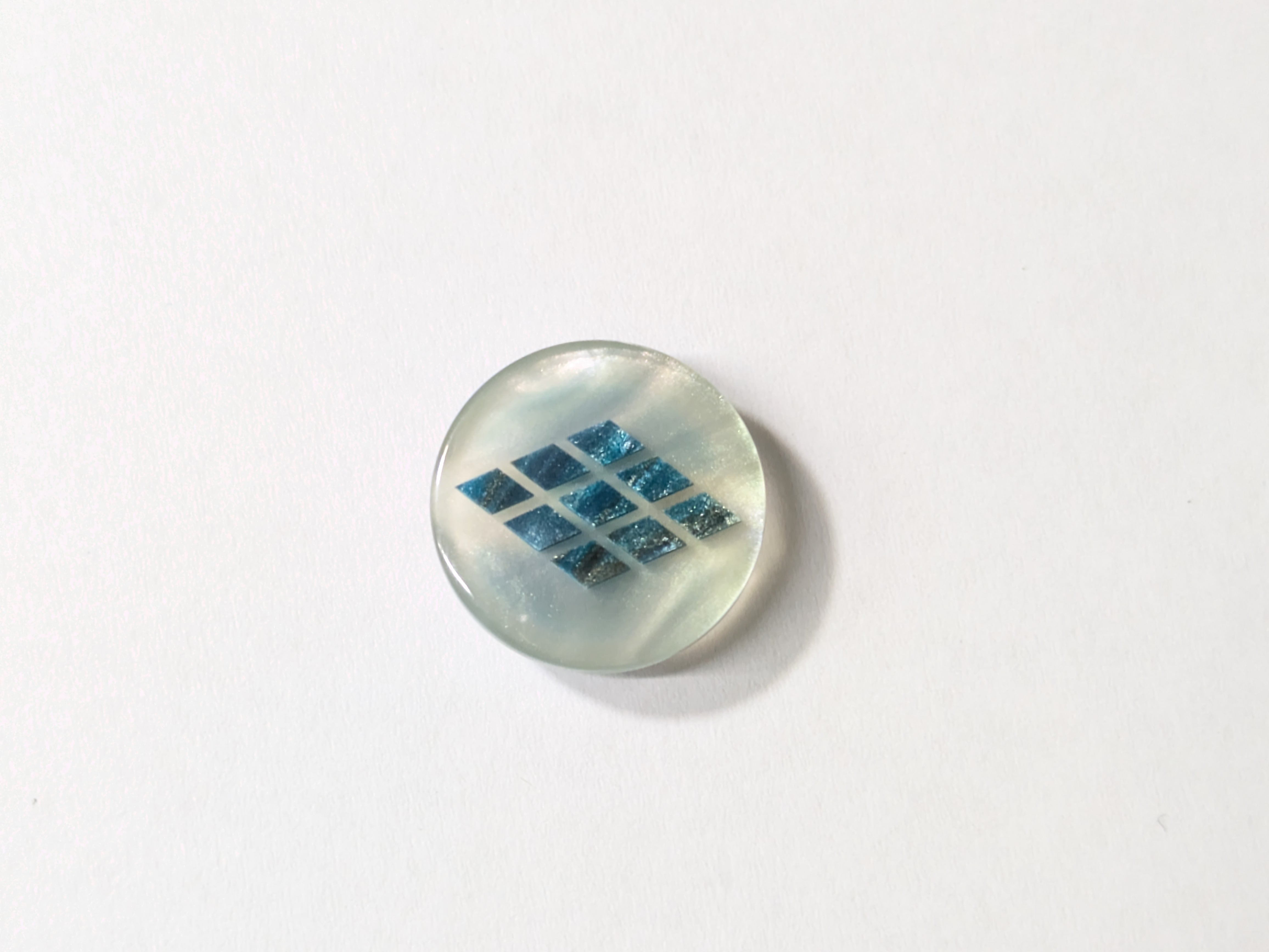 ※とても薄いグリーンに青緑のひし形模様が9個並んでいるシンプルながらも幻想的なデザインのボタンです。どこか夢の中へ引き込まれそうな魅力があり、コーディネートに特別なアクセントを加えるアイテムとしておすすめです。