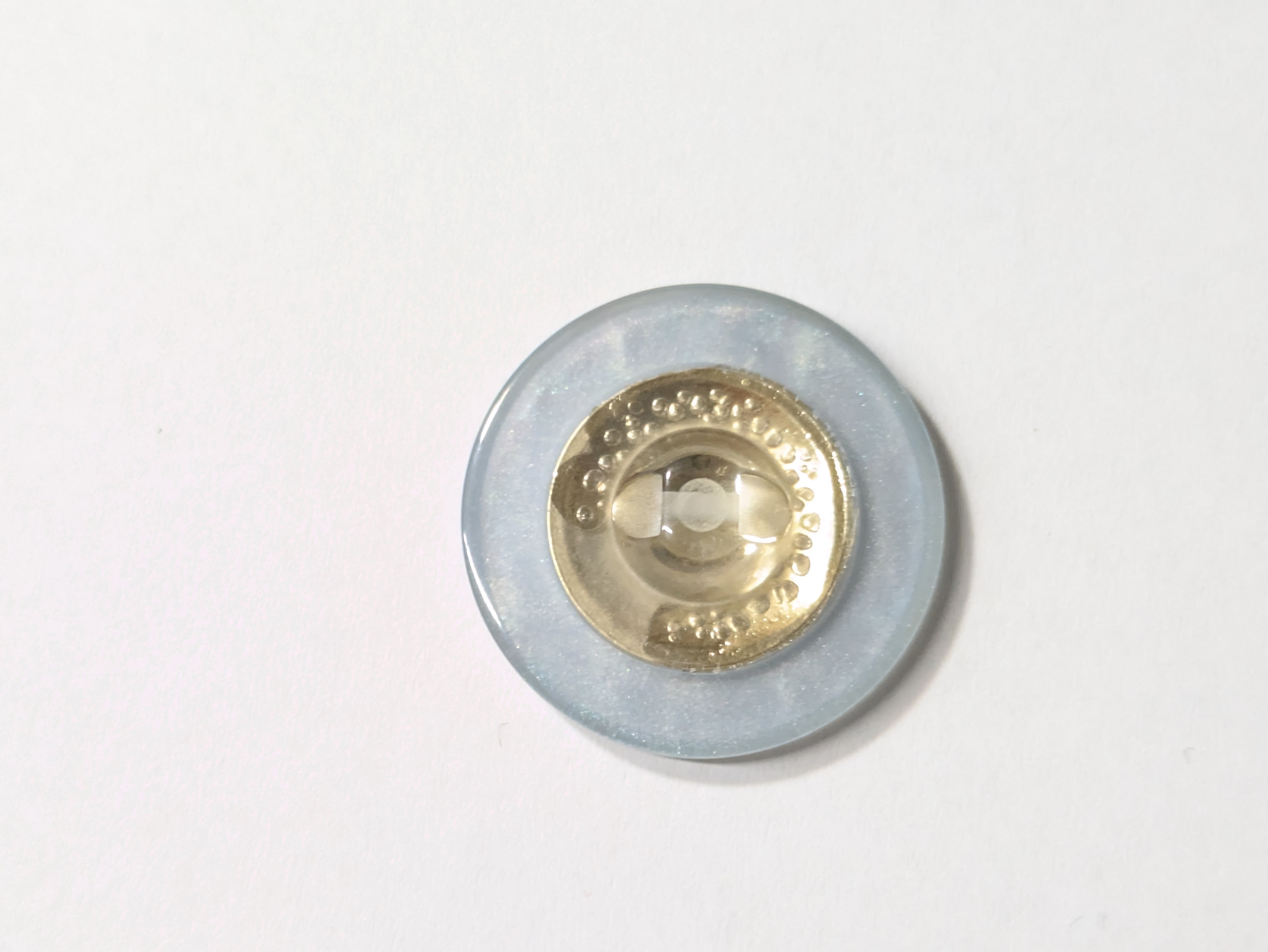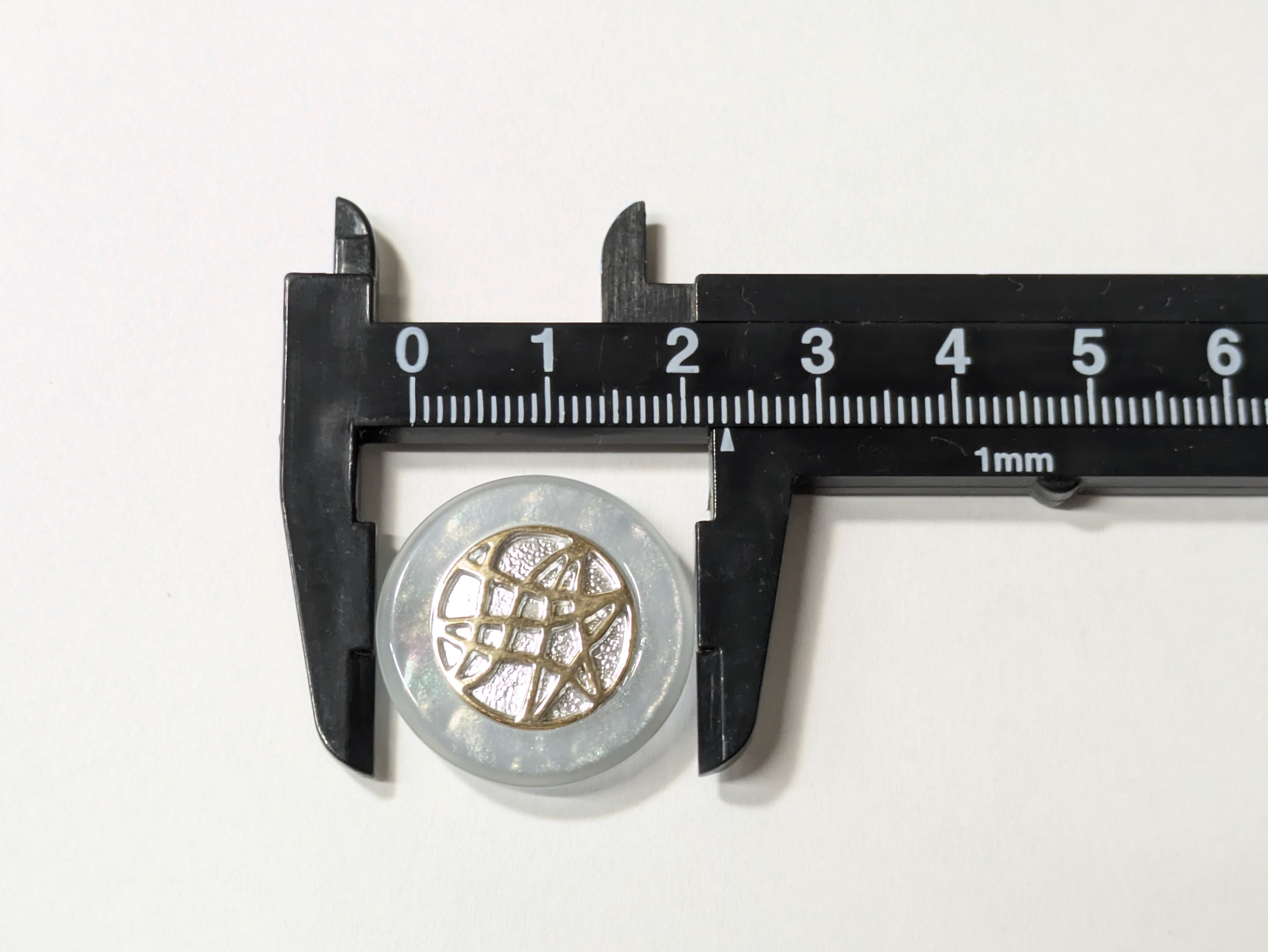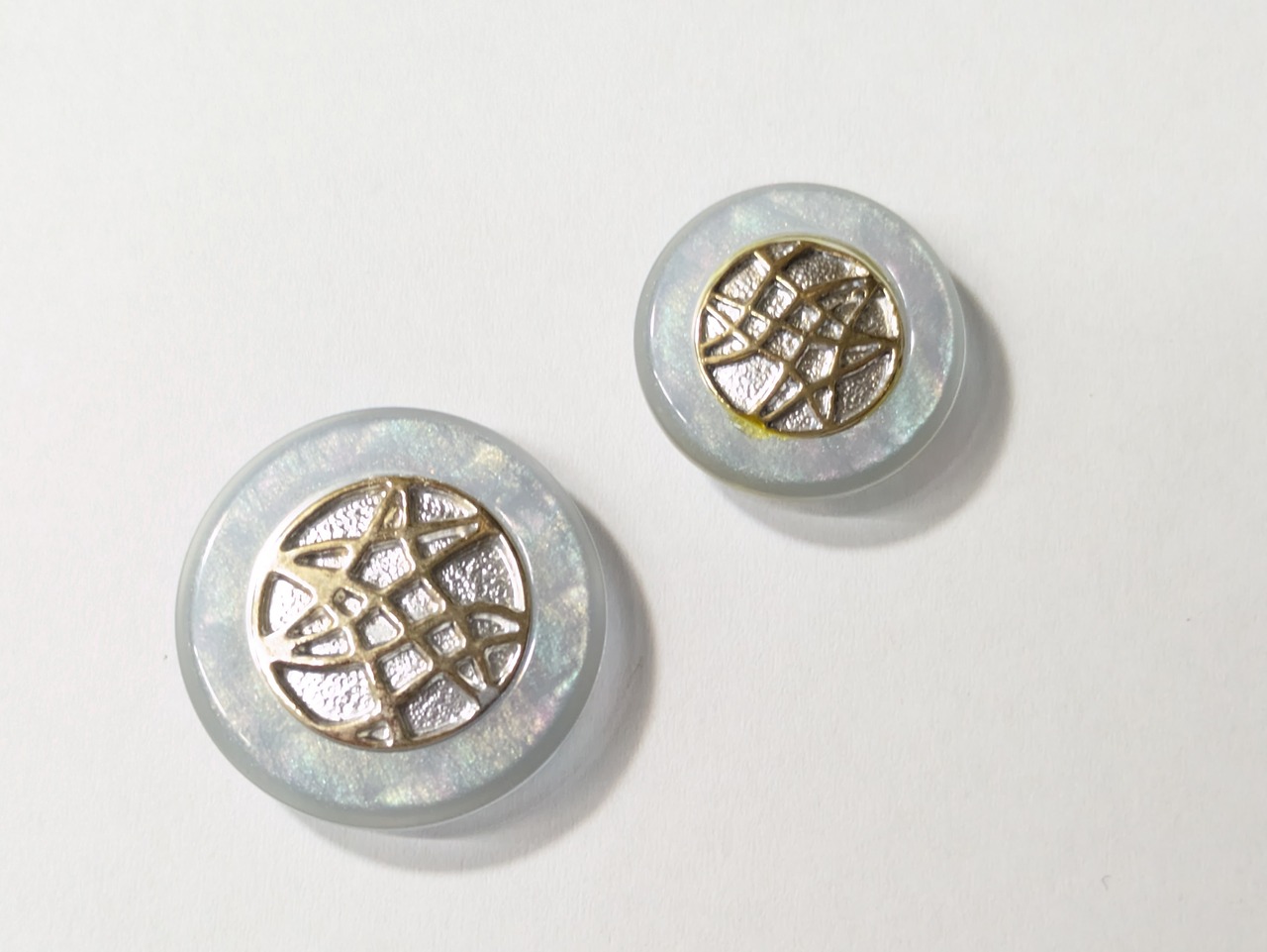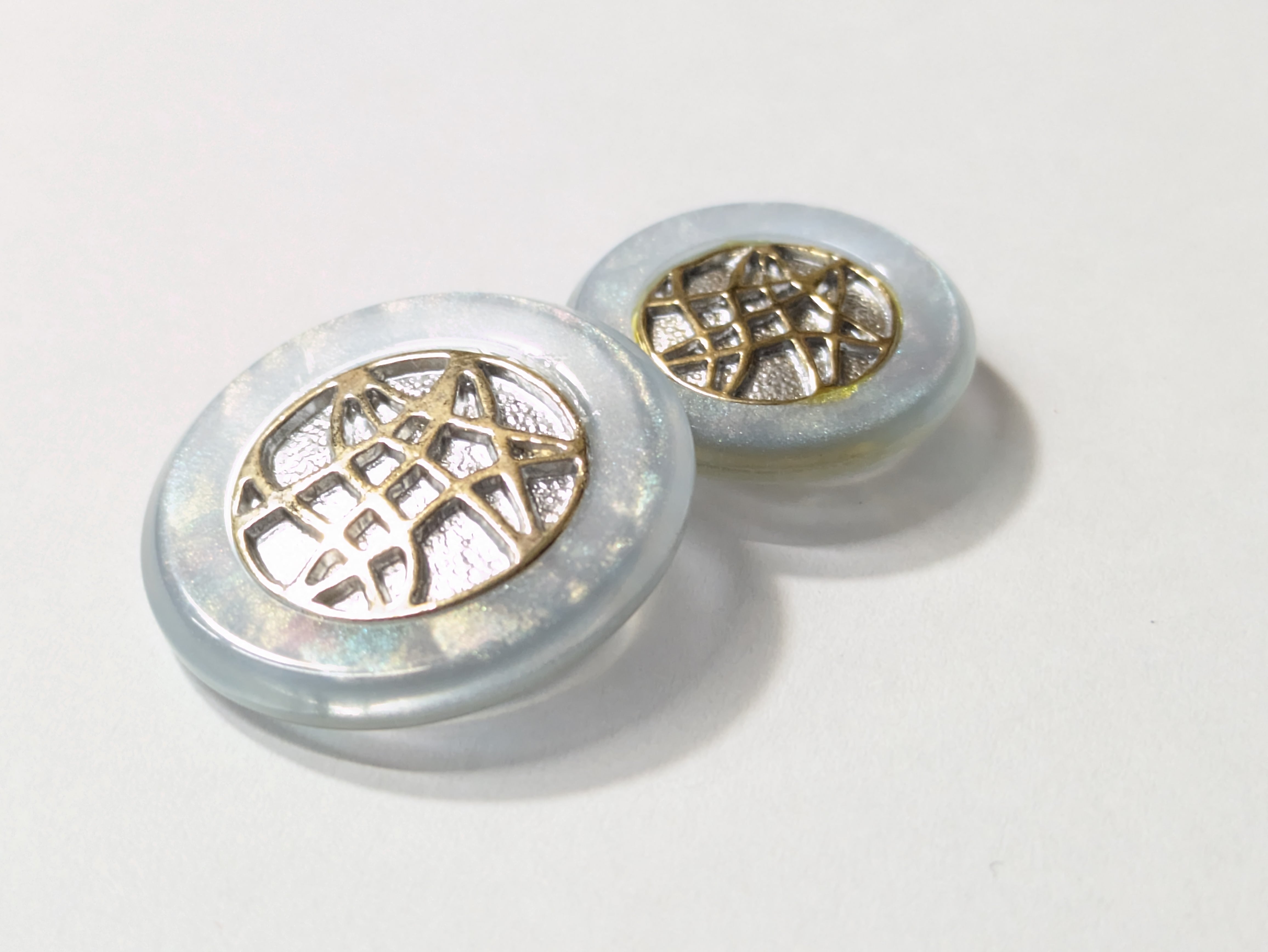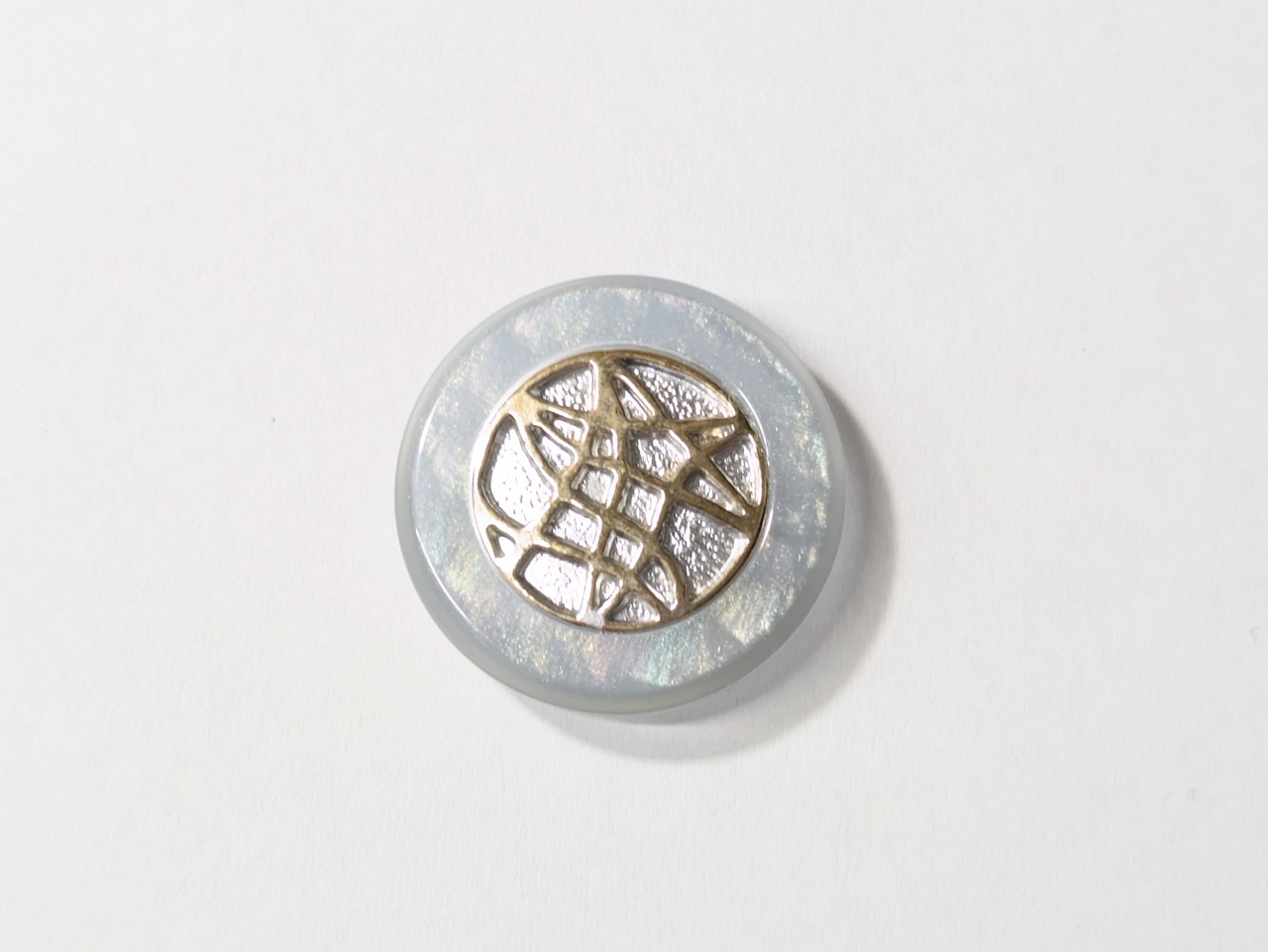 ※星のようなイメージのデザインが魅力のボタン。シルバーにゴールドの模様が描かれており、その周りはスモーキーホワイトでほんの少し紫がかって見えます。幻想的な雰囲気を纏い、コーディネートに特別なアクセントを加えるアイテムです。