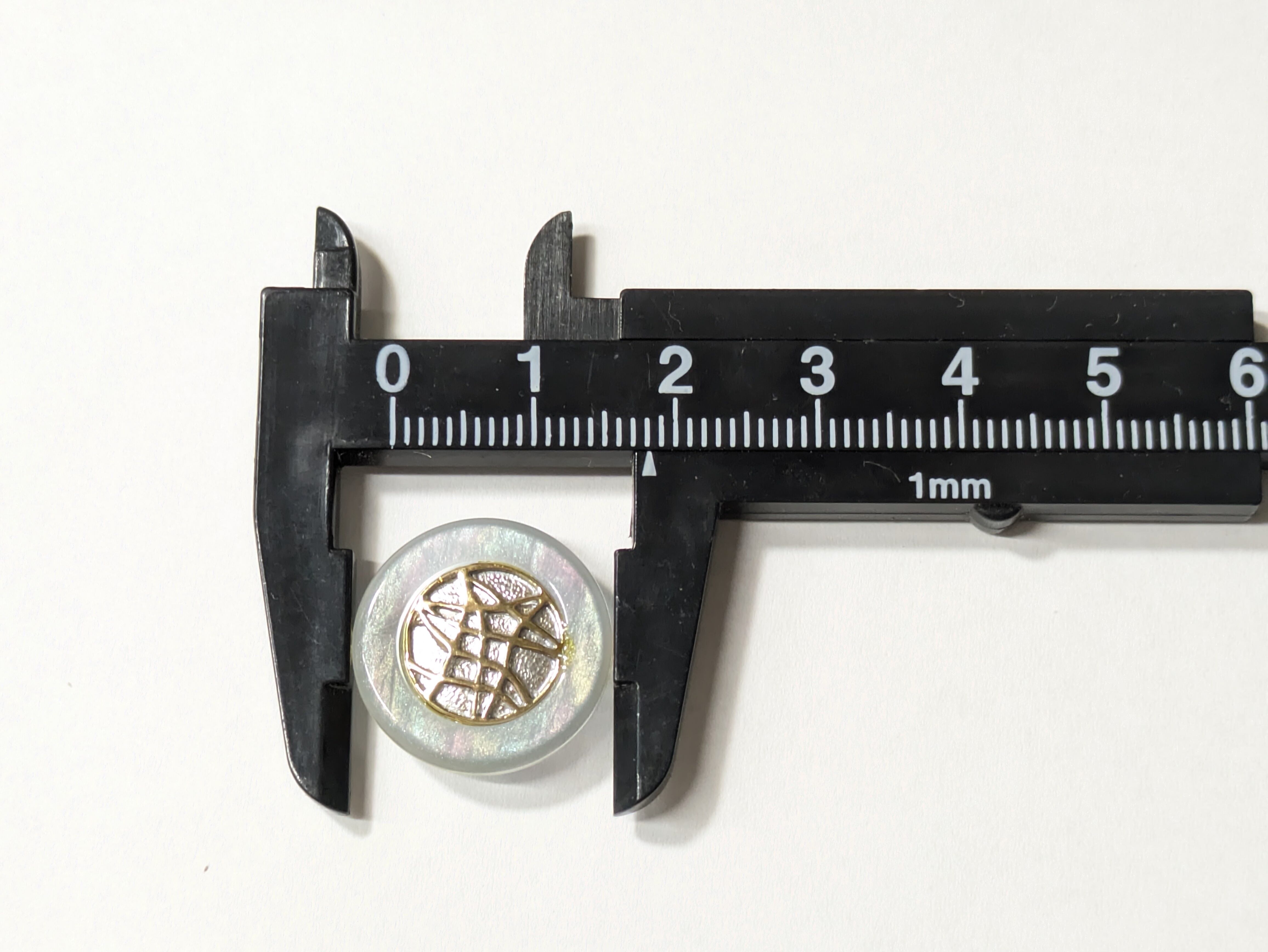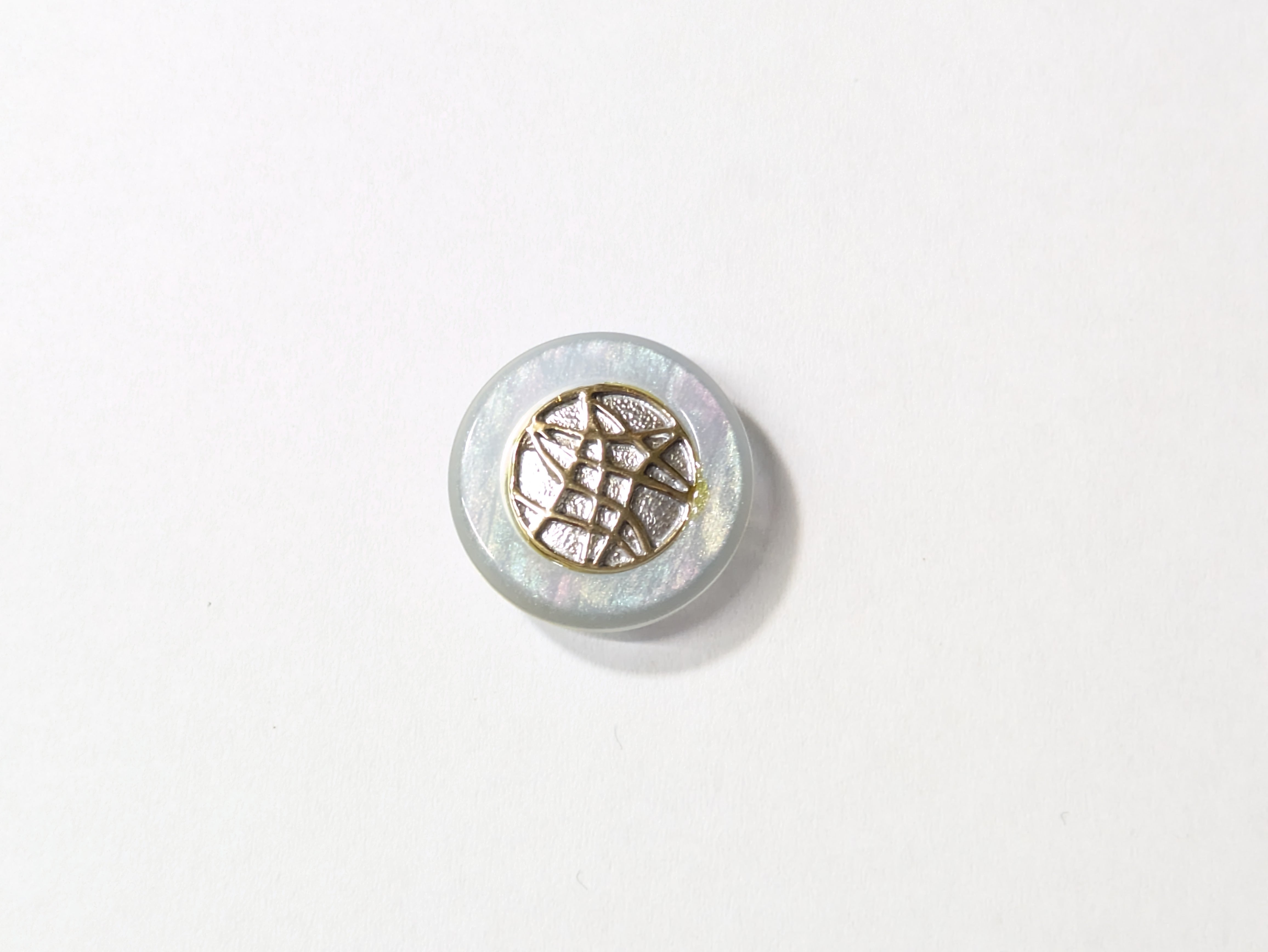※星のようなイメージのデザインが魅力のボタン。シルバーにゴールドの模様が描かれており、その周りはスモーキーホワイトでほんの少し紫がかって見えます。幻想的な雰囲気を纏い、コーディネートに特別なアクセントを加えるアイテムです。