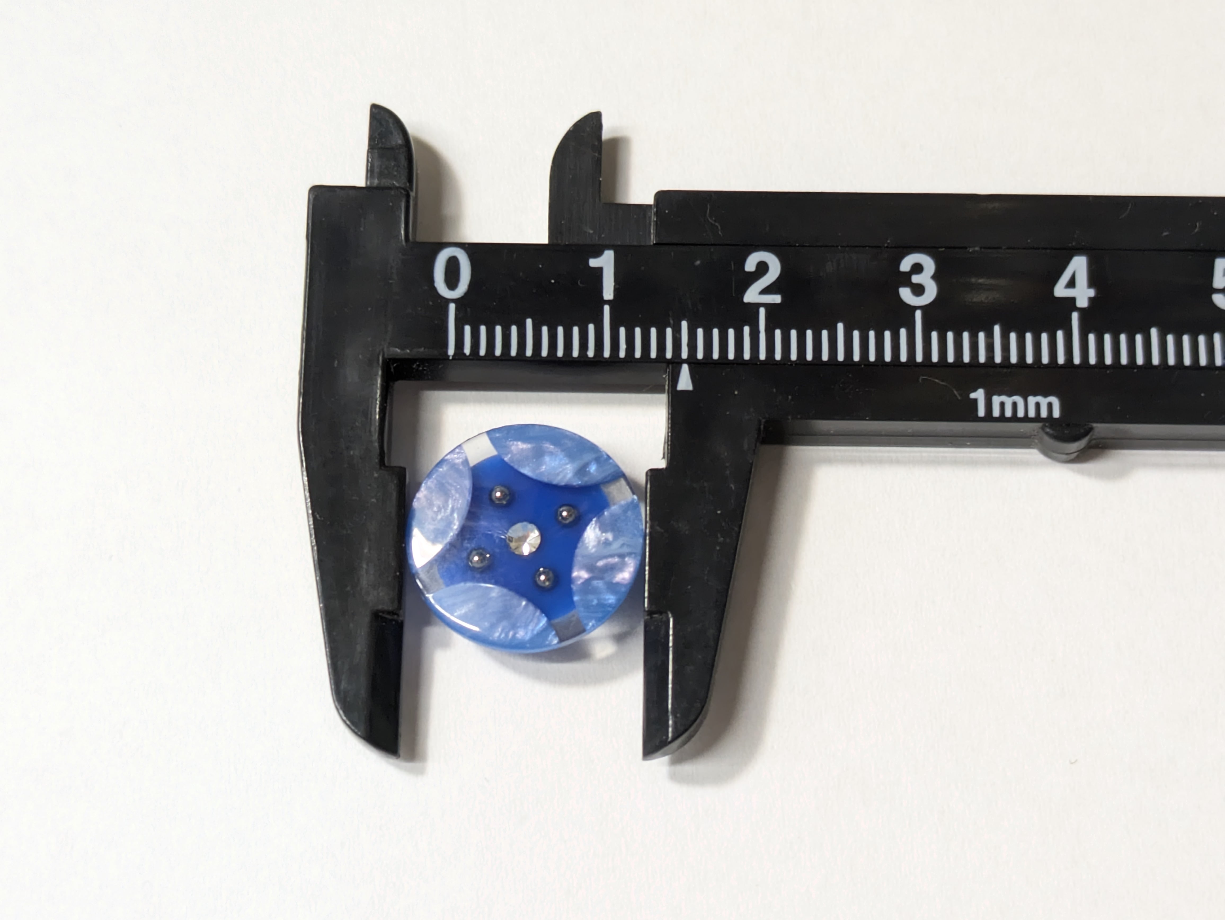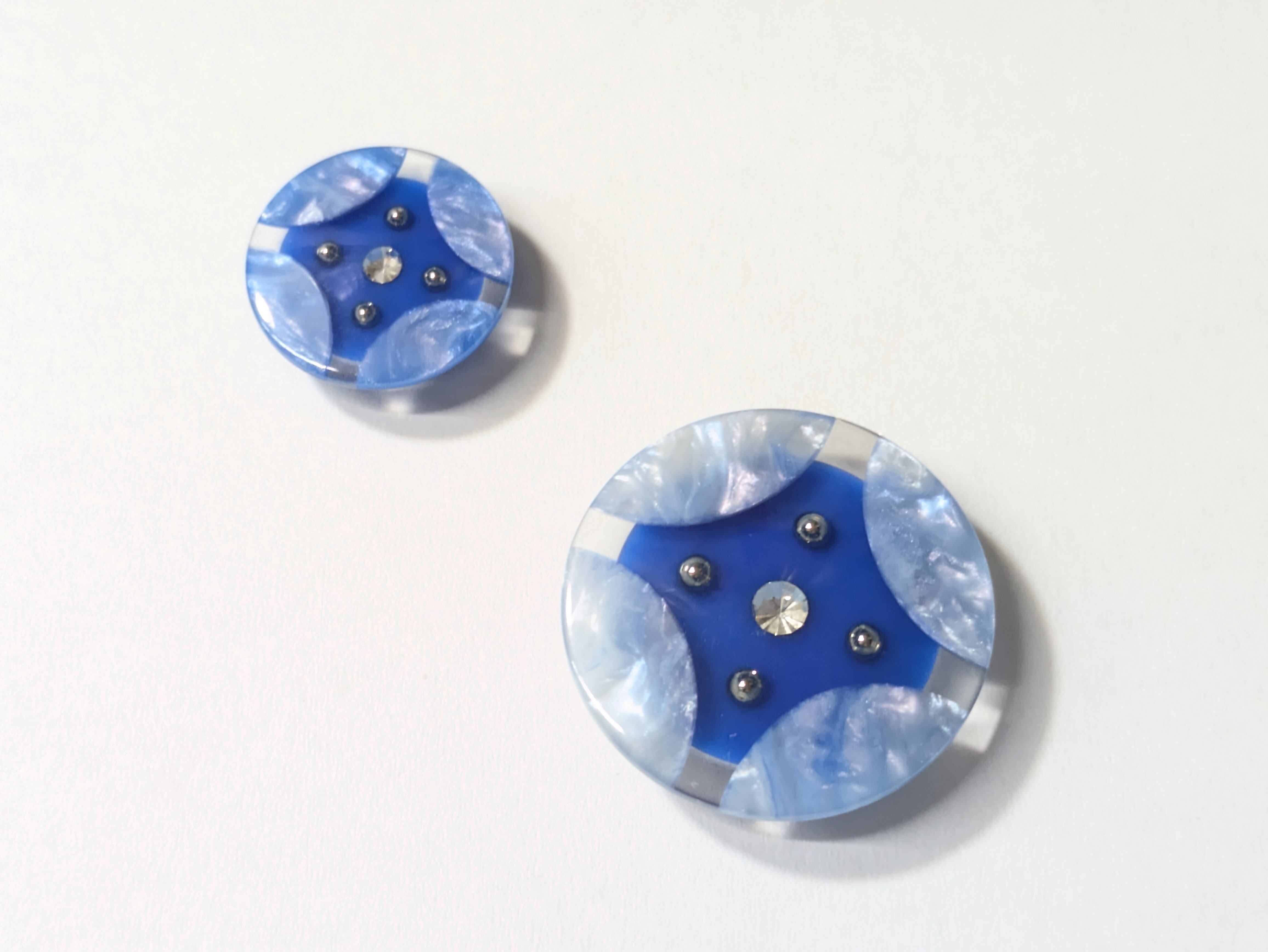 ※雪と氷をイメージさせる美しいデザインのボタンです。ブルーと淡いブルーの色合いが星形にも見える洗練されたルックスを演出。中心にあしらわれたラインストーンが、凛とした雰囲気を際立たせます。