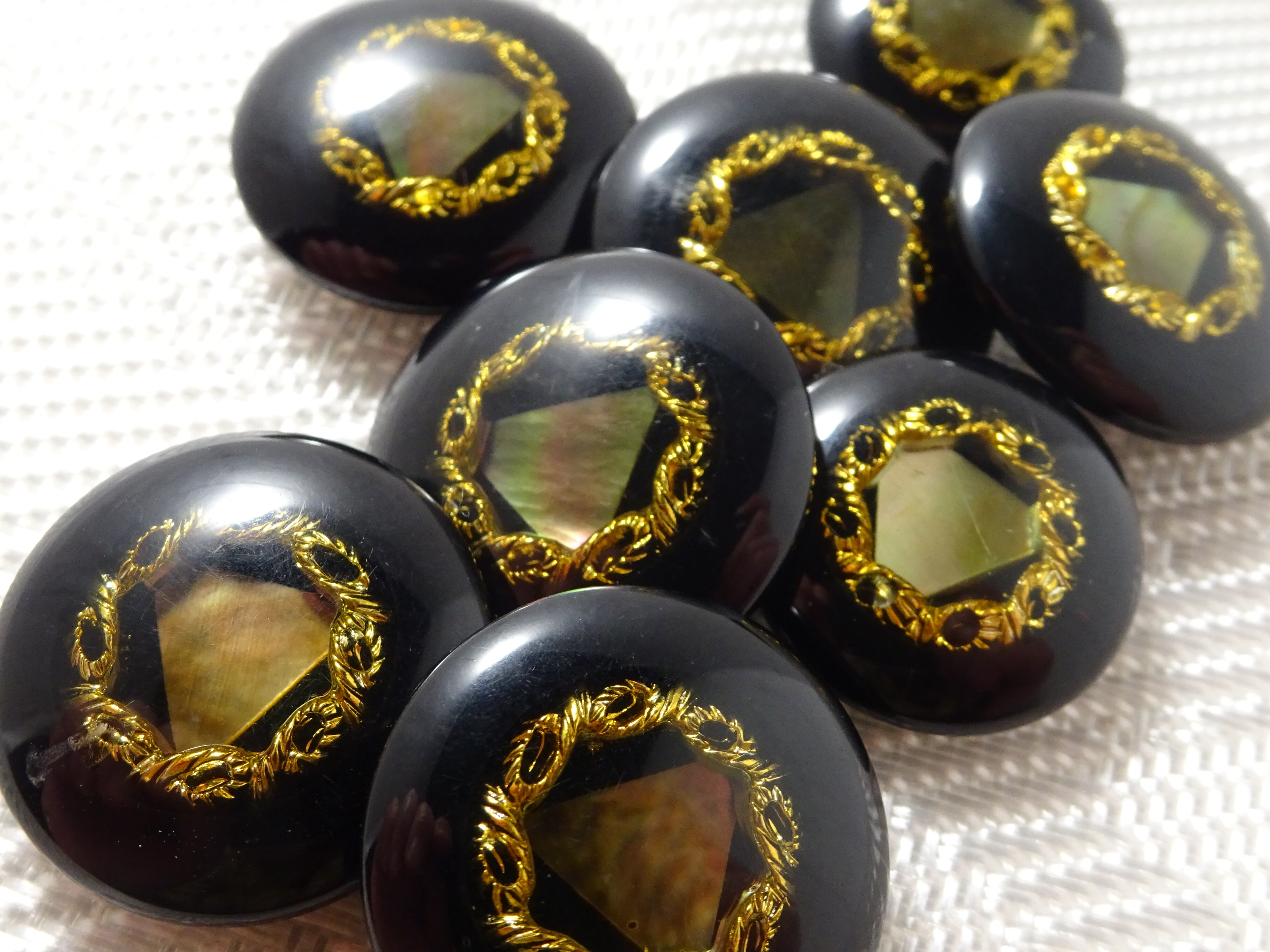 ※中央の三角シェル&ゴールドパーツが印象的なボタンです。表面は樹脂でコーティングされコロンとしています。シェルはオーロラ色に輝き見る角度によって色々な表情を見せます。個体差があります。