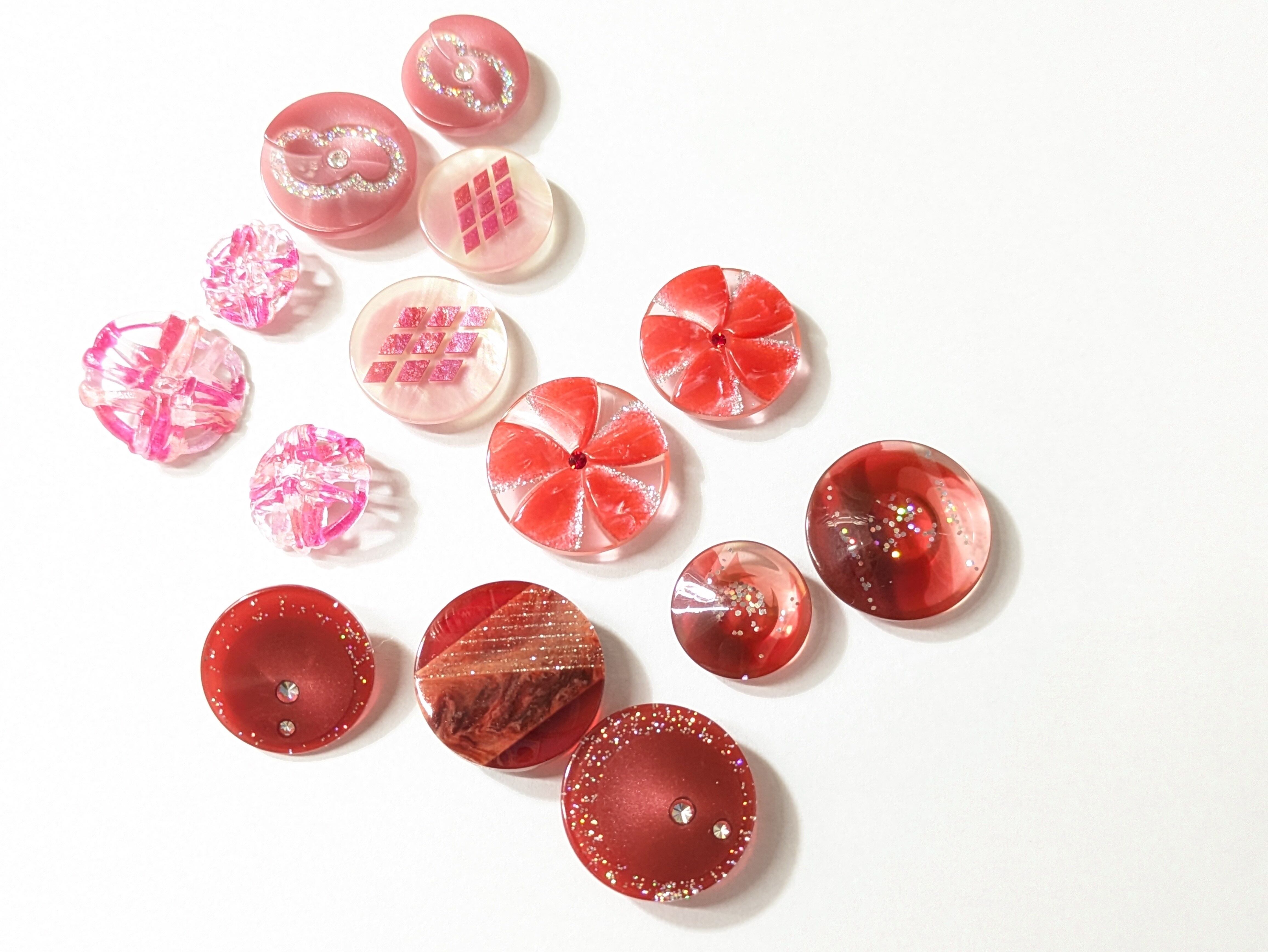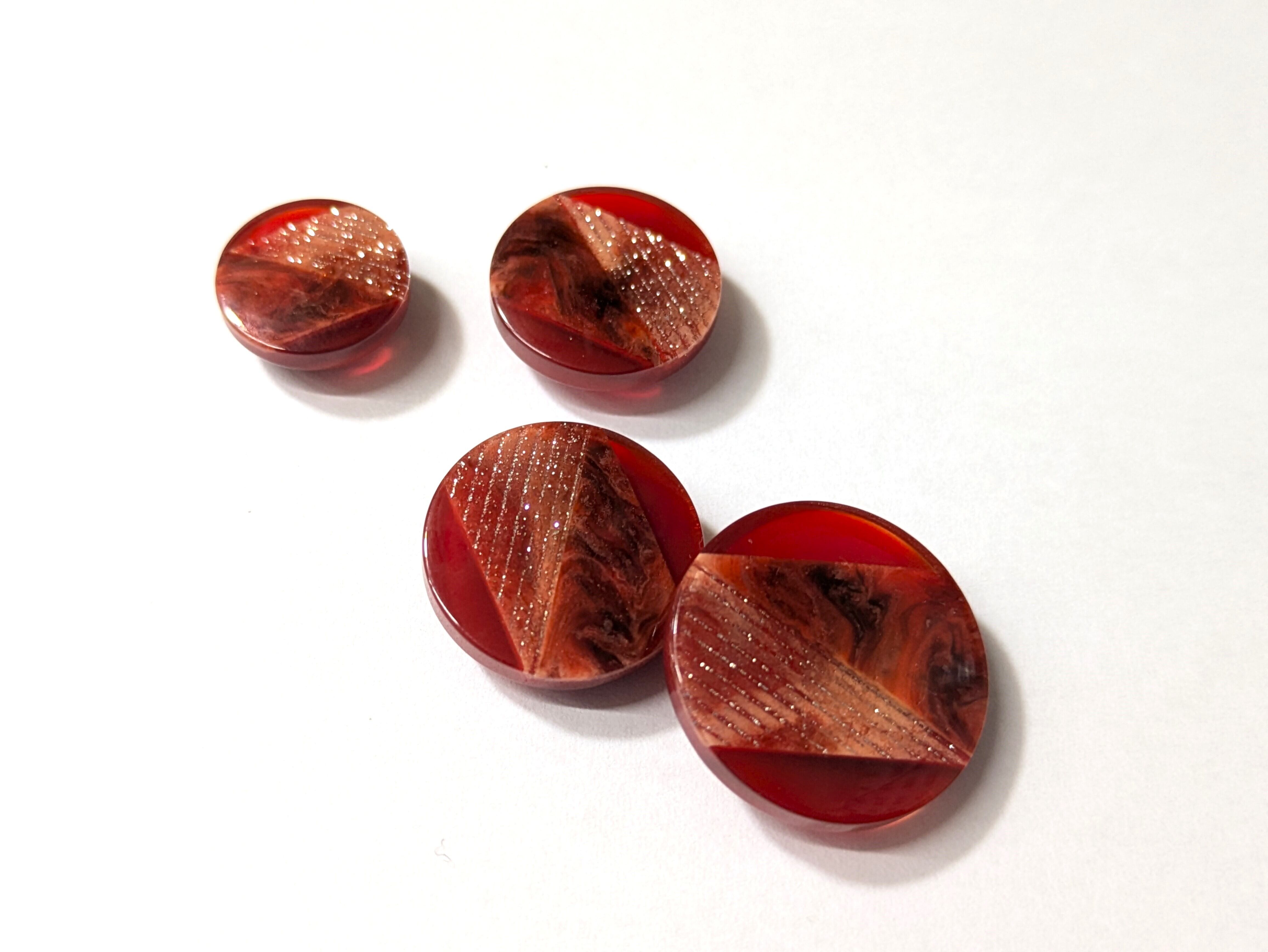 ※あかね色のボタンを縁どるようにシルバーラメがあしらわれ、ラインストーンと相まって夕焼けに輝く星と三日月のような美しい輝きを放っています。洋服やバッグなどに取り付けるだけで、一気に華やかな印象に仕上げてくれることでしょう。