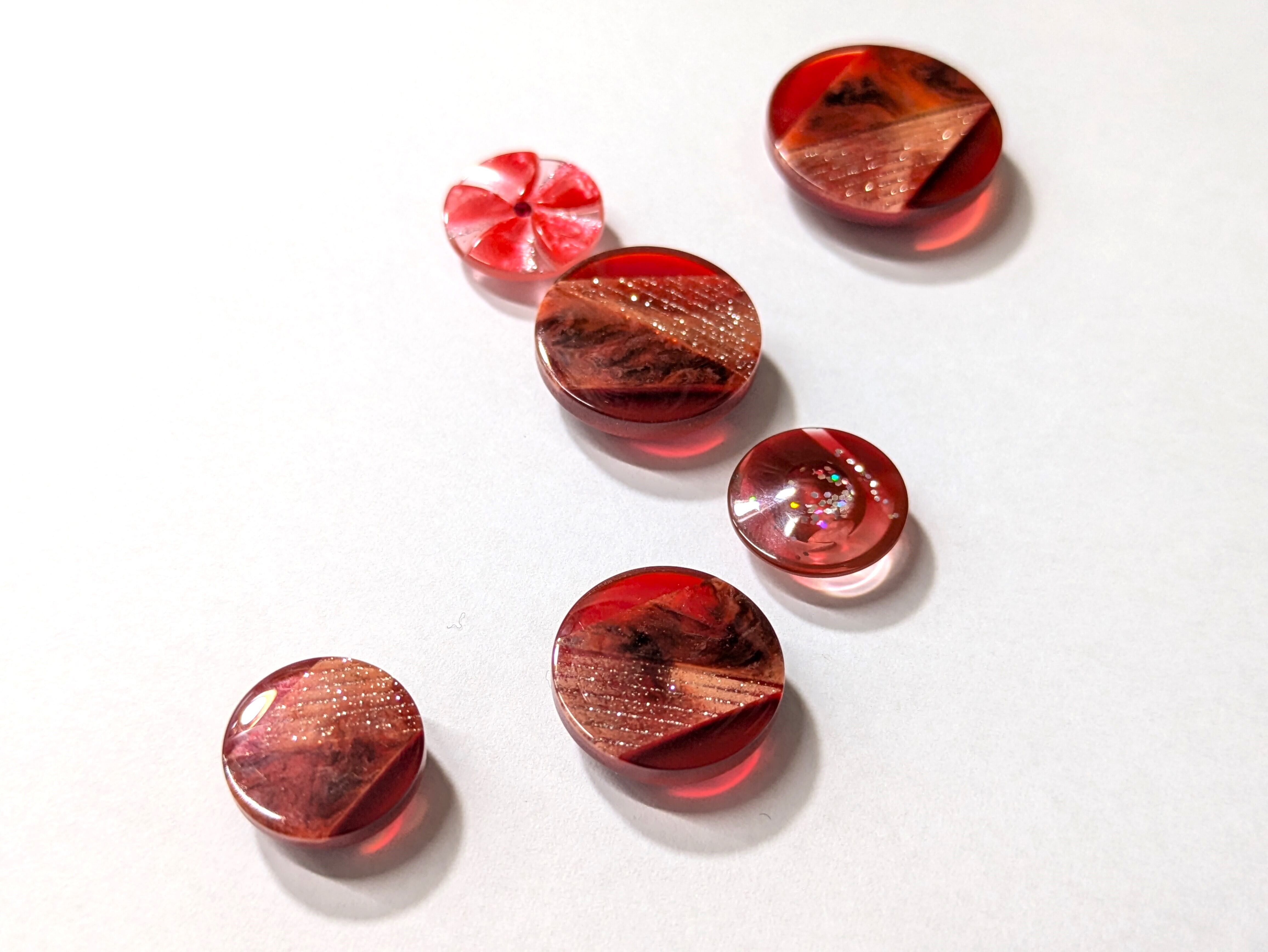 ※あかね色のボタンを縁どるようにシルバーラメがあしらわれ、ラインストーンと相まって夕焼けに輝く星と三日月のような美しい輝きを放っています。洋服やバッグなどに取り付けるだけで、一気に華やかな印象に仕上げてくれることでしょう。