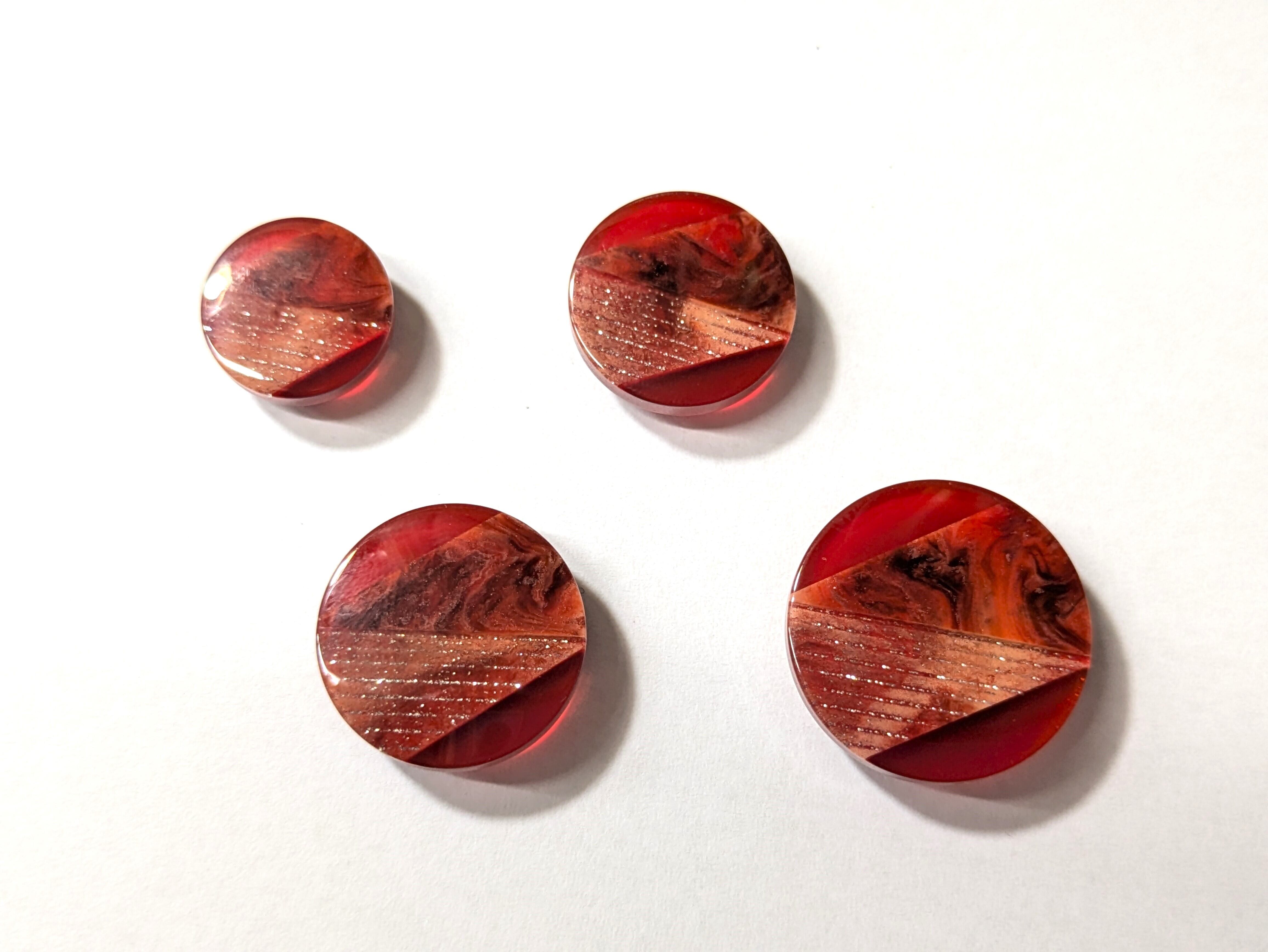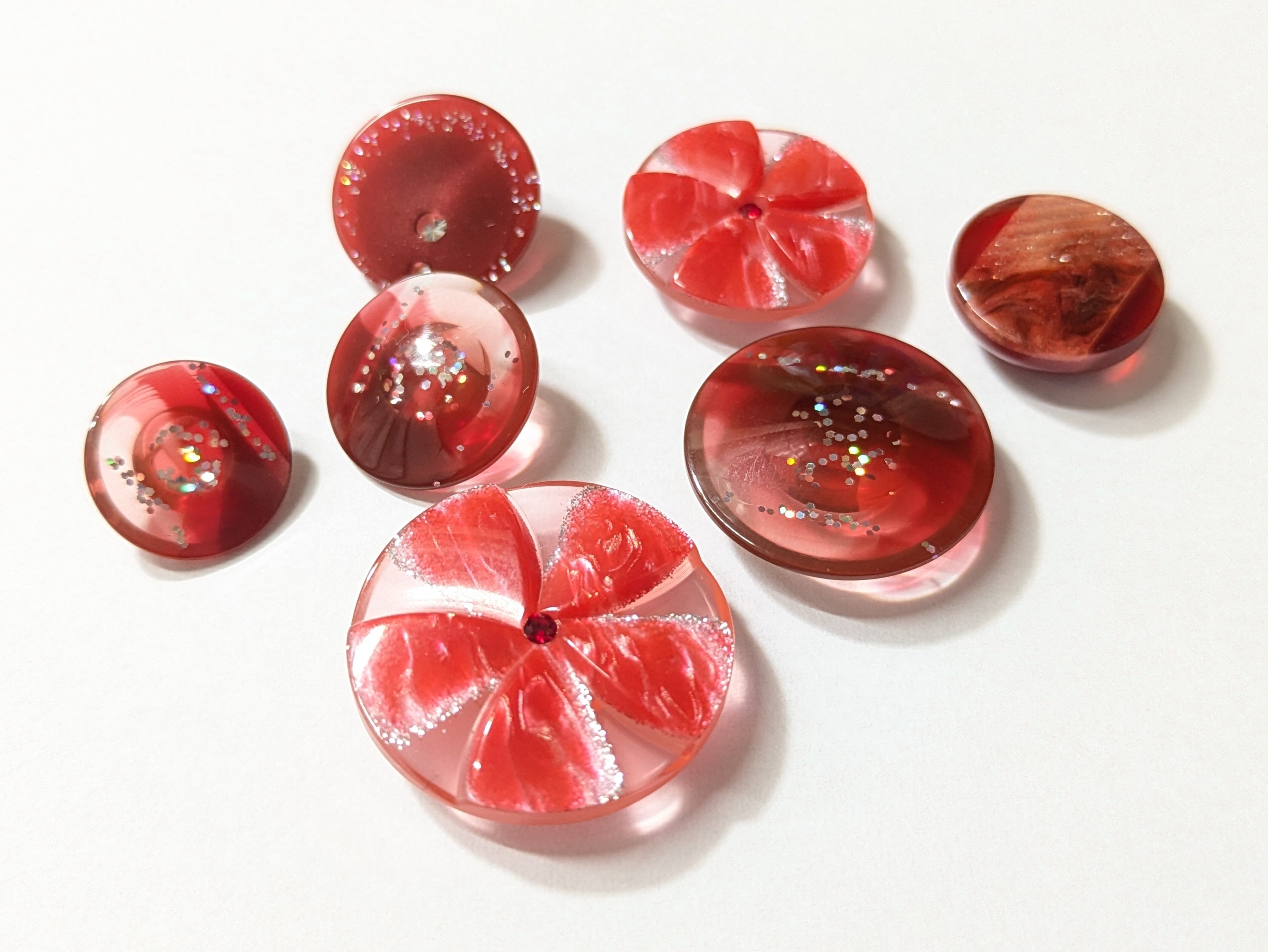 ※あかね色のボタンを縁どるようにシルバーラメがあしらわれ、ラインストーンと相まって夕焼けに輝く星と三日月のような美しい輝きを放っています。洋服やバッグなどに取り付けるだけで、一気に華やかな印象に仕上げてくれることでしょう。