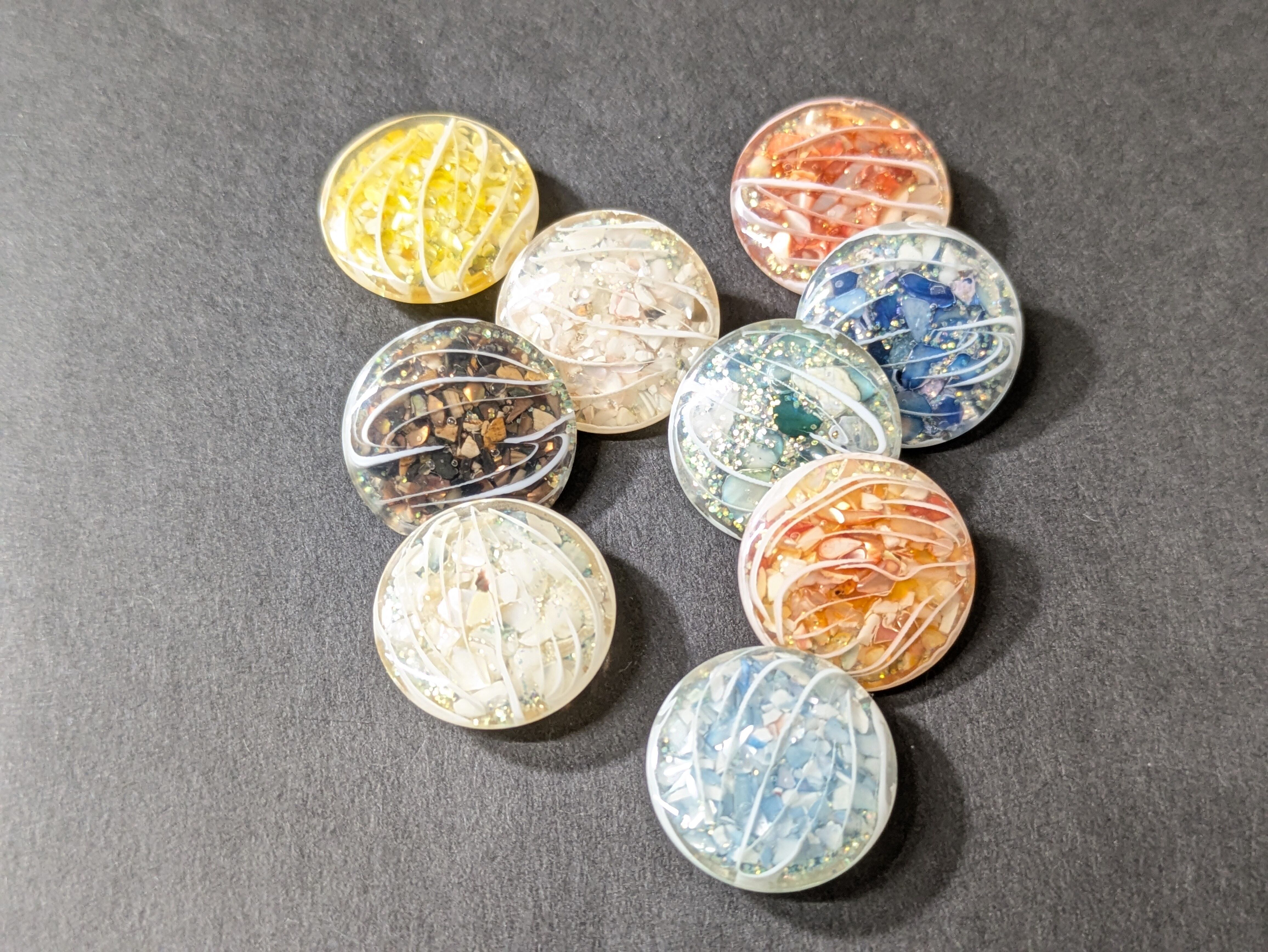 ※クリアベースにシェル、ラメ、ホログラムのジェルが閉じ込められているような美しいボタンです。表面には白い曲線模様が施されており、光に当たるとキラキラと様々な表情を見せてくれます。